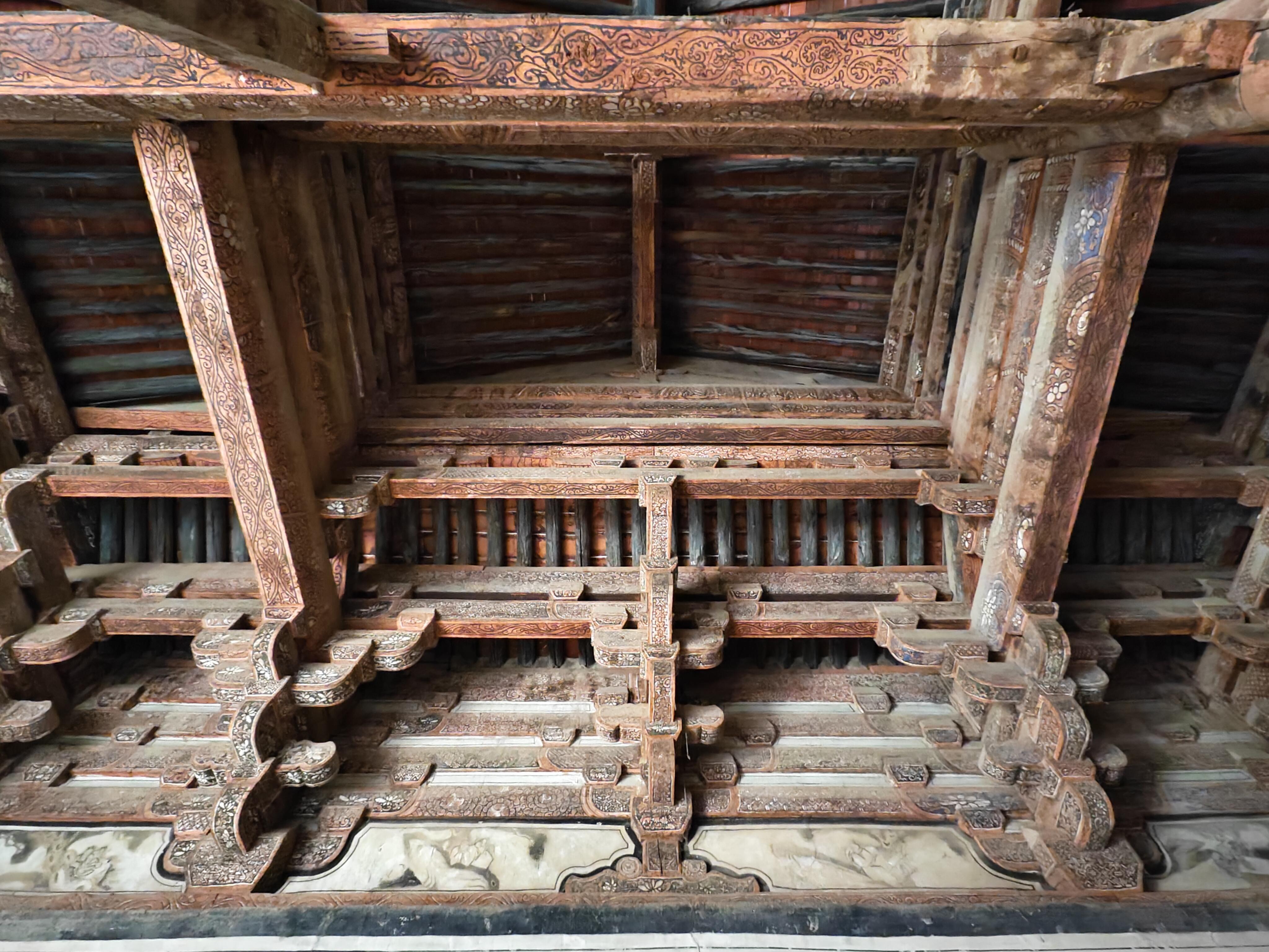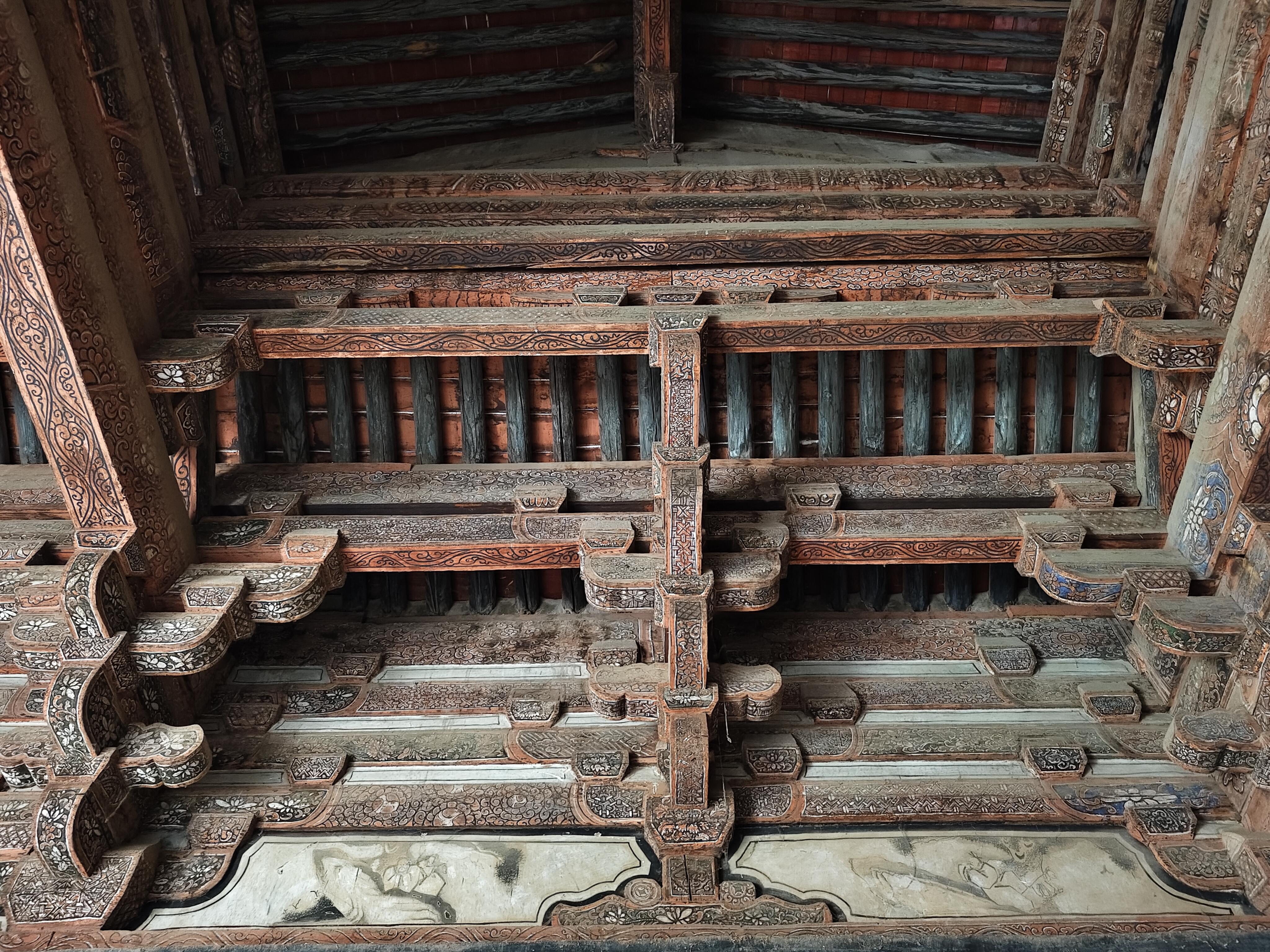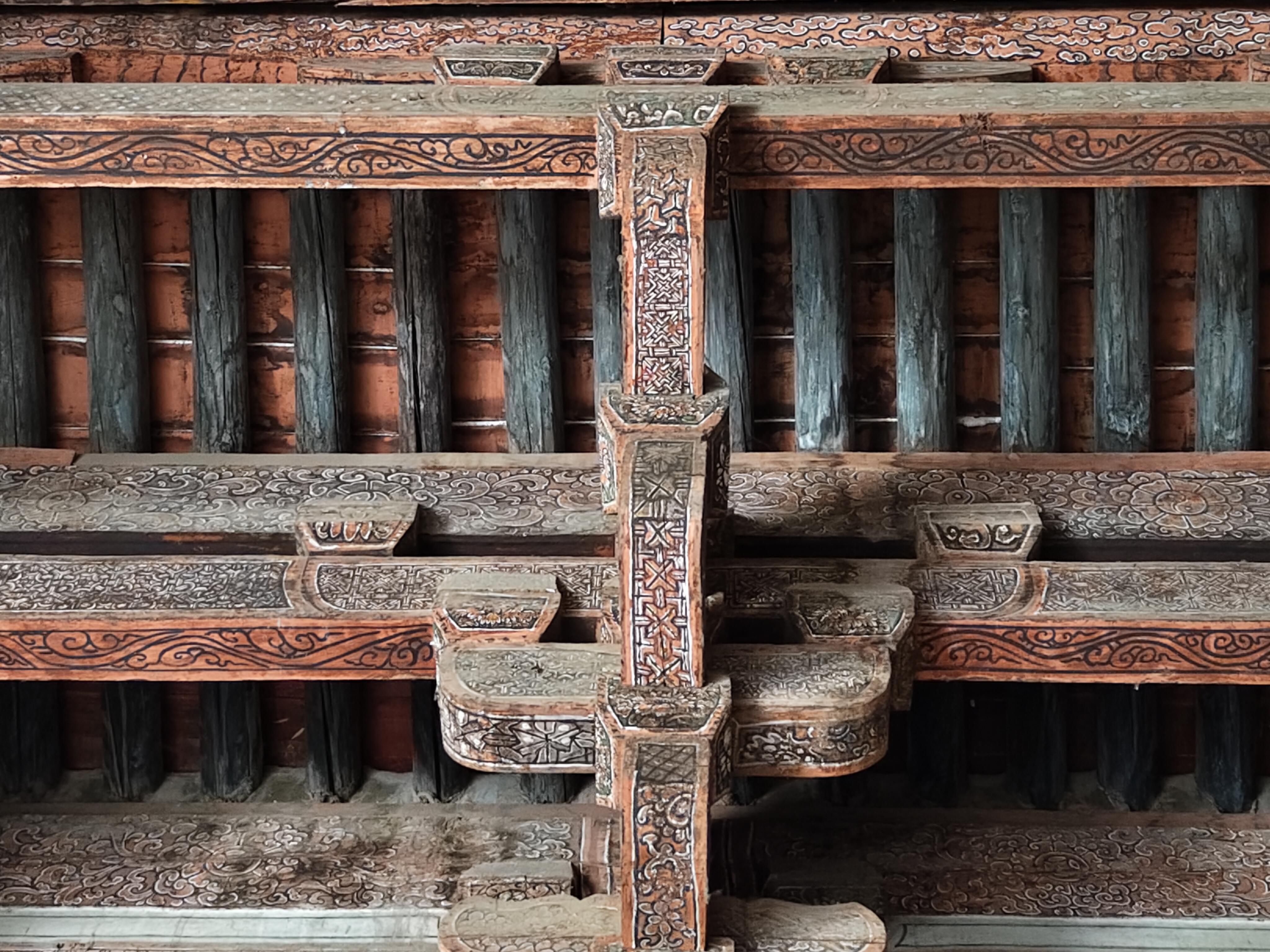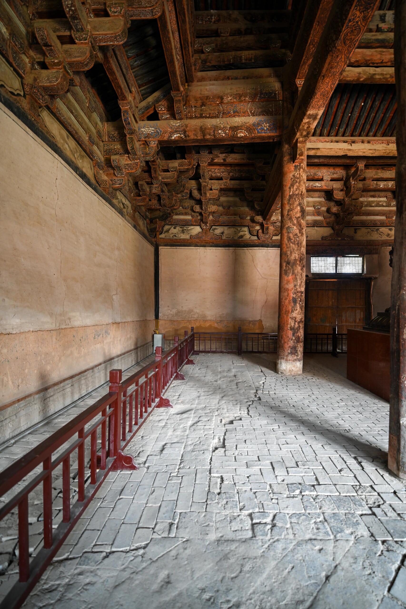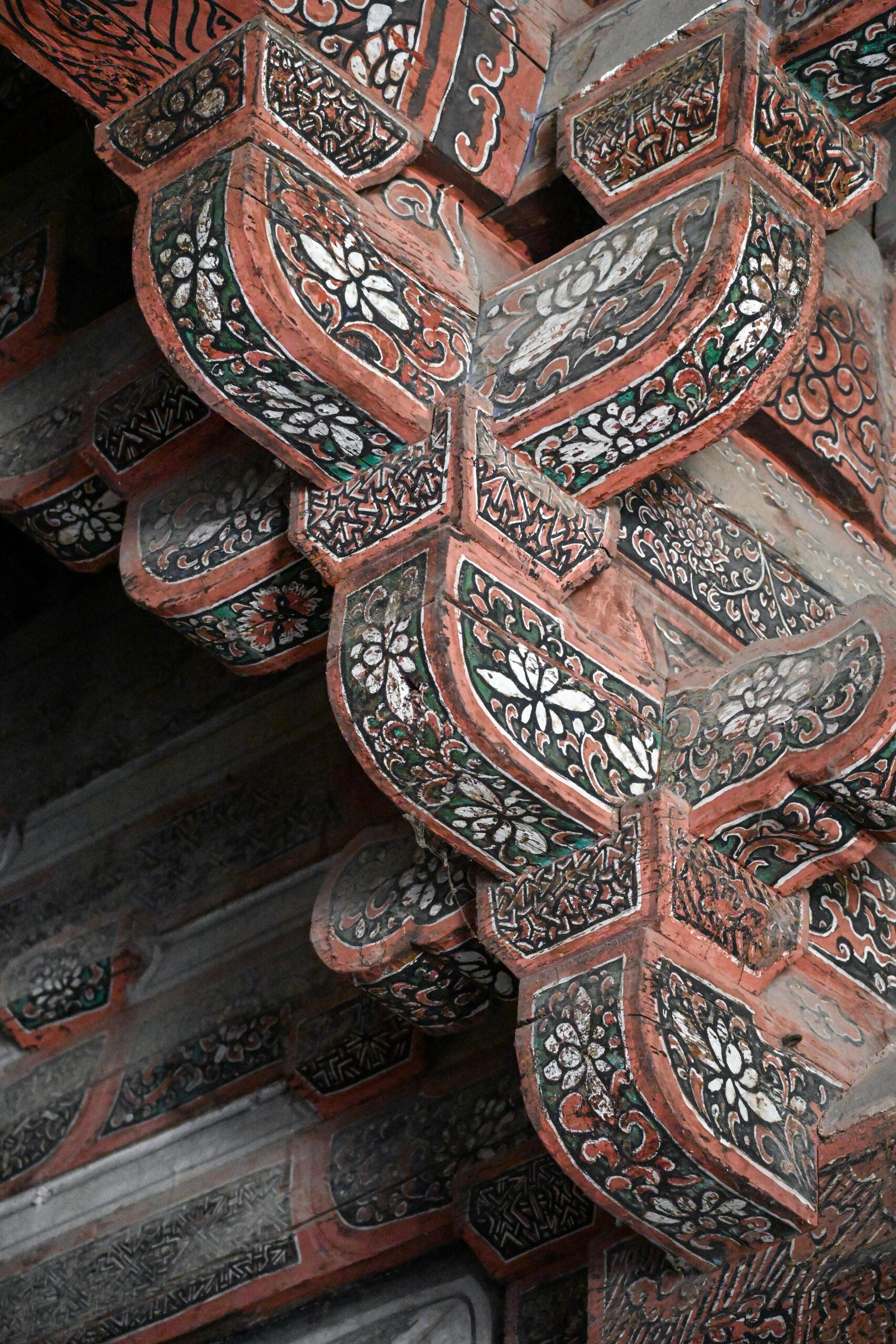 抬手抚摸殿内的立柱,指尖能感受到木材的纹理与岁月的沟壑,而头顶的彩画在昏暗的光线下依旧熠熠生辉。据说,这些彩画在金代、明代都曾经历过修缮重描,但后世的工匠们始终怀着敬畏之心,严格遵循着辽代的原始风格,没有随意改动图案与色彩,才让我们今天有幸看到如此完整的辽代彩绘风貌。这不禁让人想到,在那个没有现代科技的年代,工匠们是如何在高耸的梁架上精准绘制这些复杂图案的?他们又是如何调配出如此稳定持久的矿物质颜料的?每一个疑问的背后,都是古人非凡的技艺与极致的匠心。