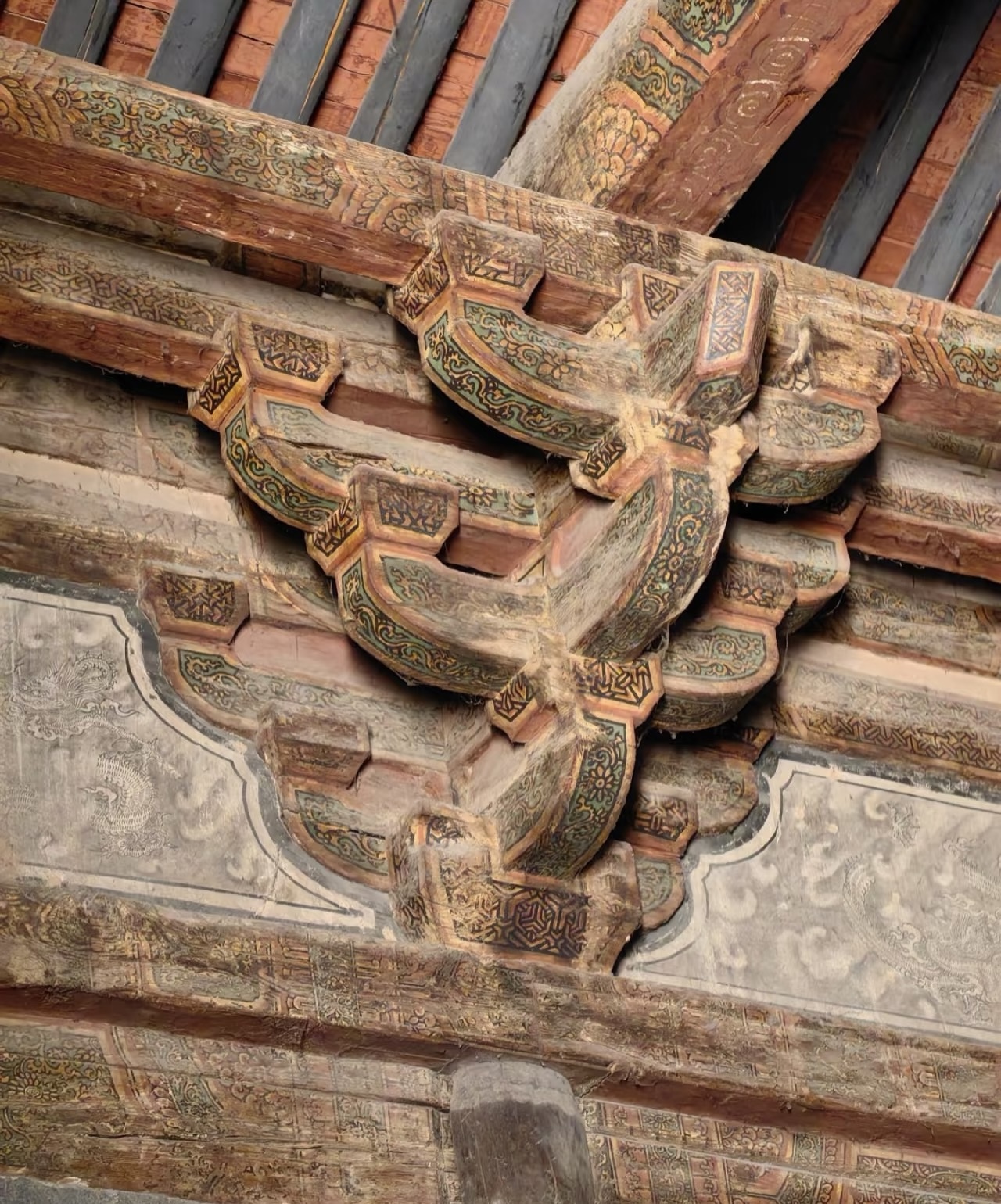 后来才得知,这些彩画是全国现存最早的“五彩杂间装”彩绘实例之一,与《营造法式》中记载的风格一脉相承。“五彩杂间装”是古代彩绘中等级较高的一种,以多种色彩交错搭配,形成华丽而不失庄重的装饰效果,而文殊殿的彩画,正是这种风格最鲜活的见证。工匠们采用天然的矿物质颜料绘制,这种颜料稳定性极强,不易褪色,即便历经千年风雨、多次修缮重描,依旧能保持鲜艳的色彩。绿色作为底色,沉稳而典雅,墨线勾勒的轮廓清晰有力,白色平涂填充其间,让图案层次分明,再辅以红色的热烈与金色的华贵,冷暖平衡,浓淡相宜,构成了极具视觉冲击力的色彩盛宴。