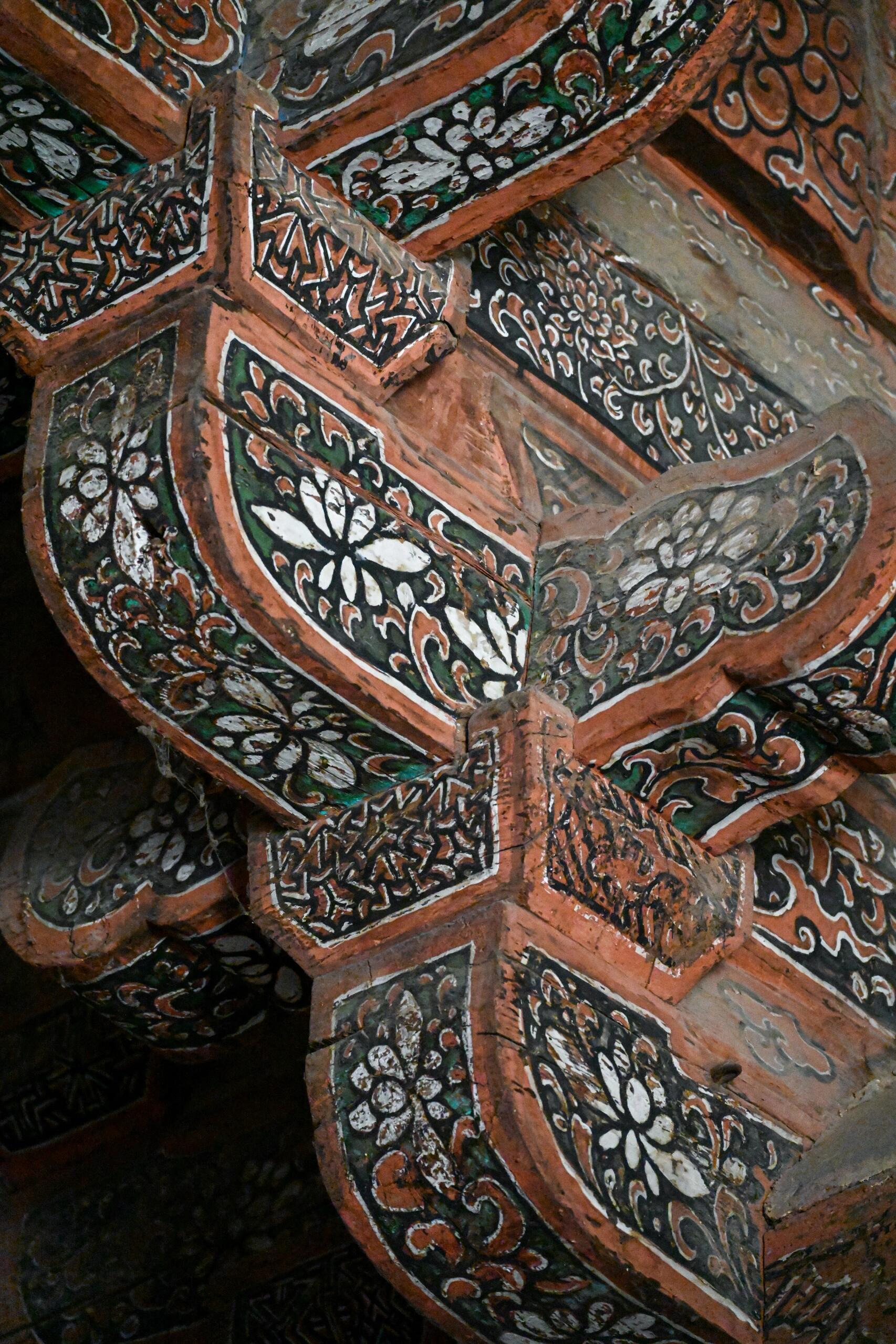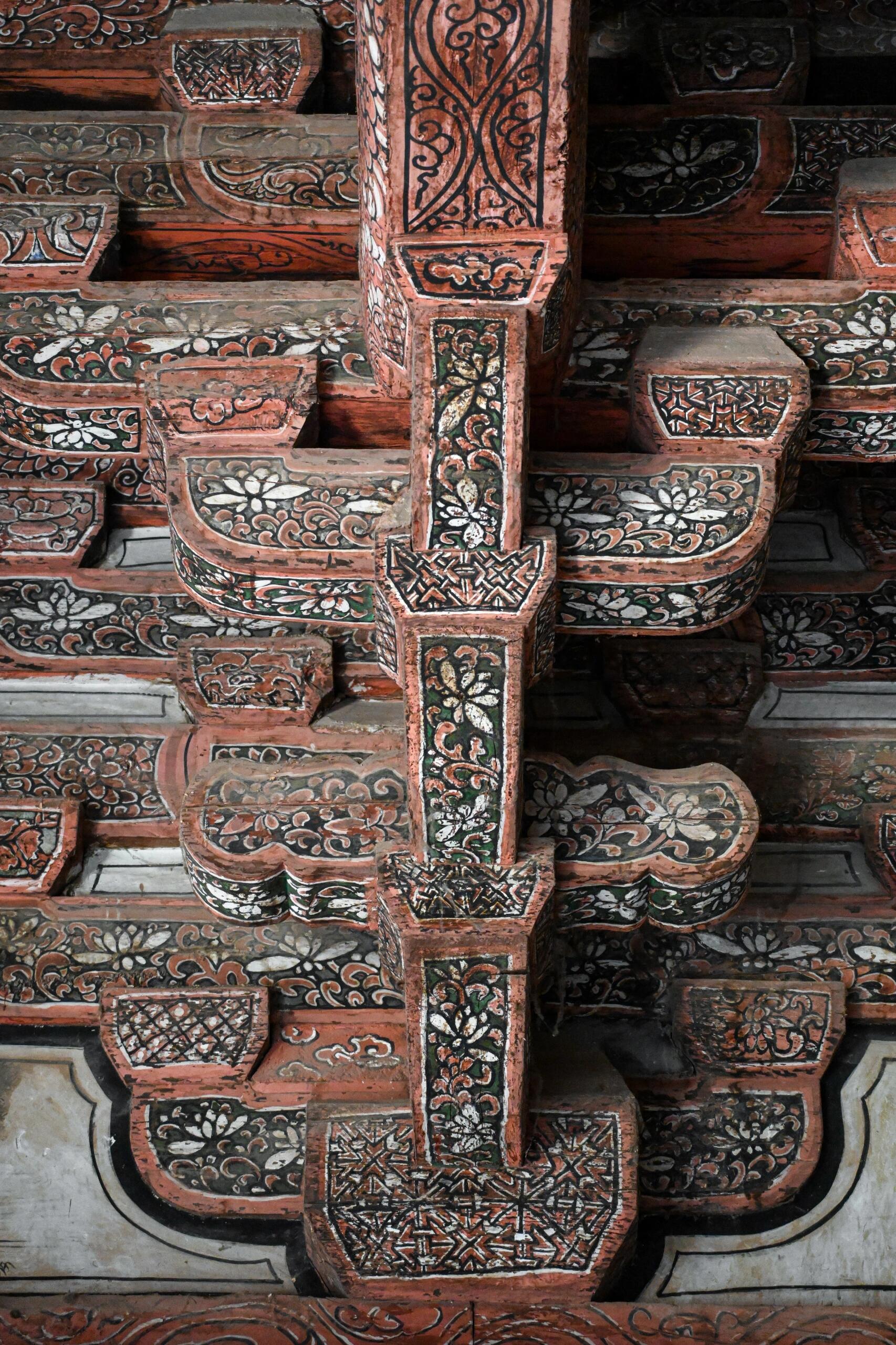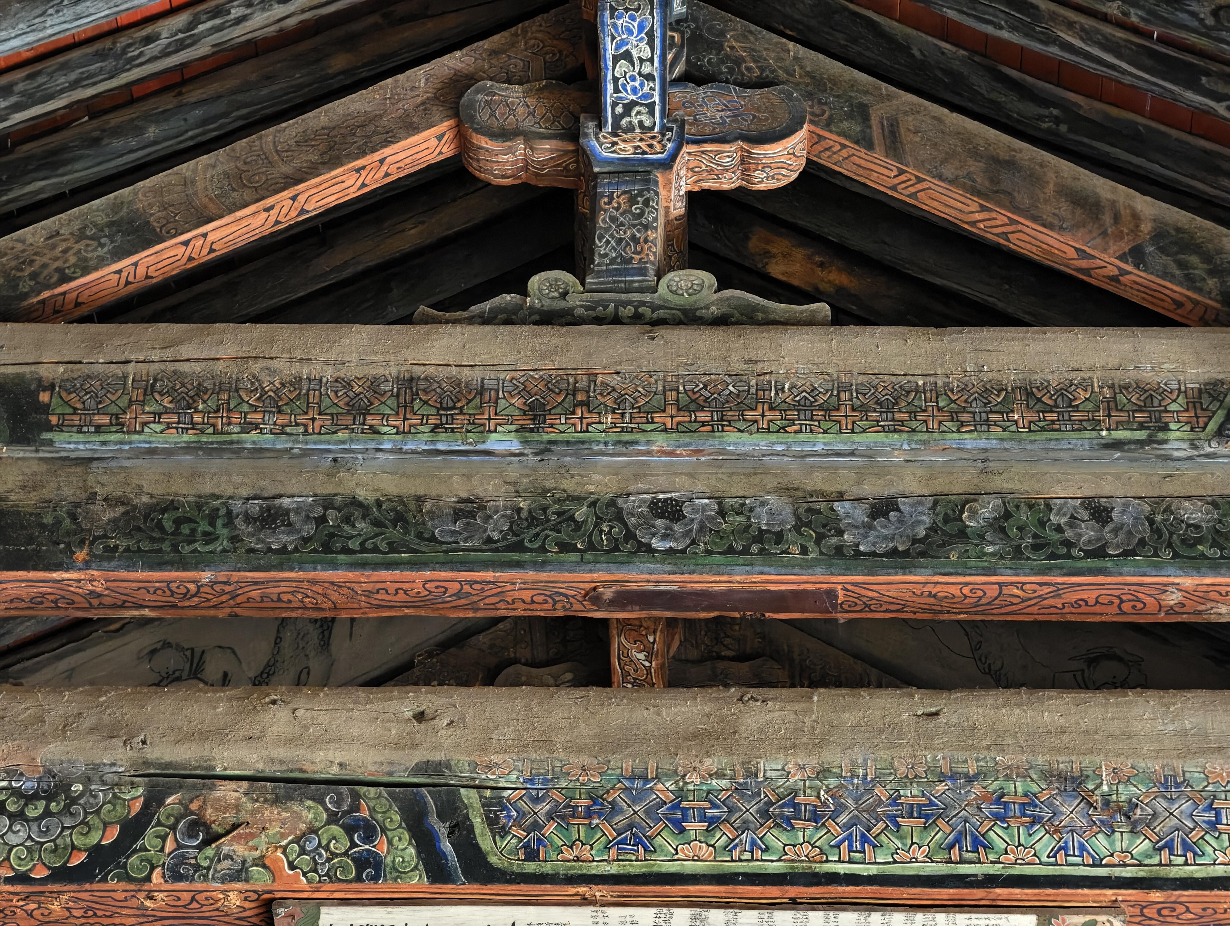 殿内的彩画不仅是视觉的盛宴,更藏着辽代的文化密码。辽代是契丹族建立的王朝,草原民族的豪放与汉地文化的细腻在这座殿宇中完美交融。彩画的色彩浓烈奔放,带着草原民族的热情;而图案的精巧细腻,又透着汉地传统文化的雅致;佛教植物纹样的大量运用,则彰显了辽代对佛教的尊崇。这些彩画就像一部立体的史书,记录着辽代的文化交融、审美情趣与宗教信仰,让我们得以透过色彩与线条,触摸到千年前那个王朝的鲜活气息。