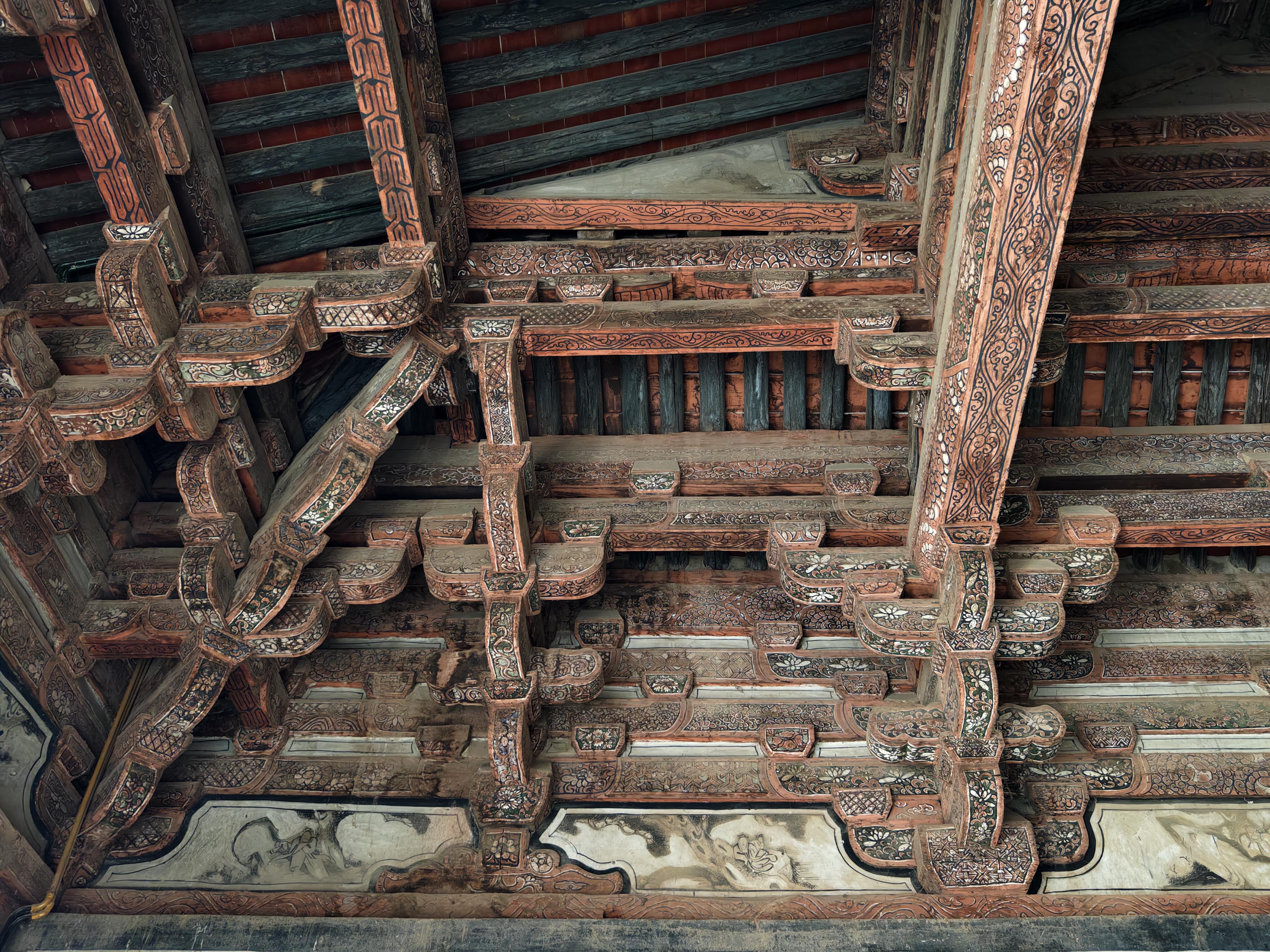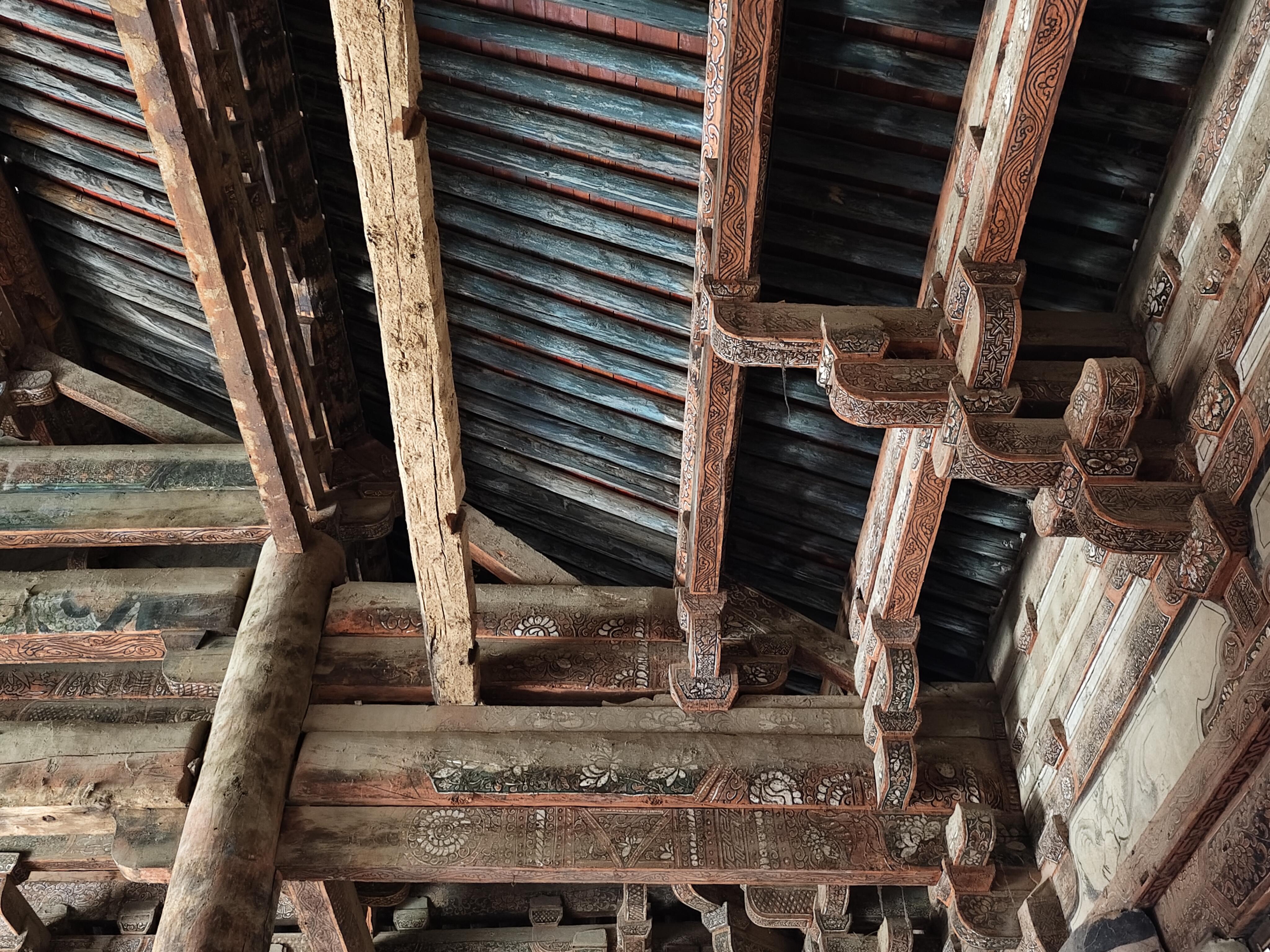 踏上高台,推开那扇厚重的木门,一股混合着木材、香火与矿物质颜料的独特气息扑面而来。殿内光线略显昏暗,起初只能隐约看到佛坛上的造像轮廓,待眼睛渐渐适应后,抬头的瞬间,整个人都被眼前的景象震撼得说不出话来。斗拱与梁架之上,密密麻麻的彩画铺展开来,青、绿、红三色为主调,冷暖交织,再点缀以少量金色,如同打翻了天帝的调色盘,将整座殿内映照得流光溢彩。那些色彩鲜艳得仿佛不是历经千年的古物,反而像是昨天才刚刚绘制完成,鲜活得能滴出水来。