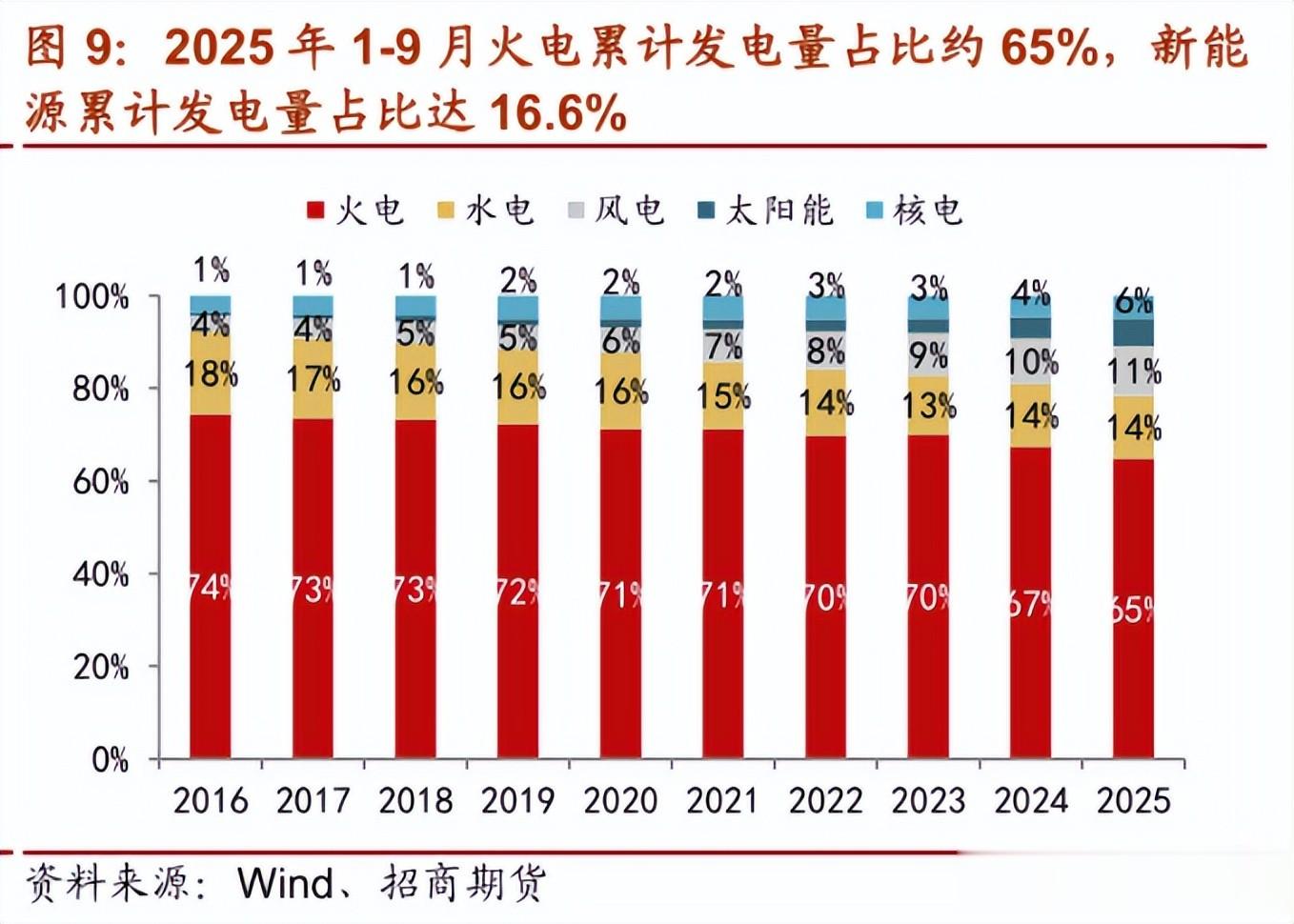 2025年前三季度,尽管风光装机同比增长超25%,但火电发电量占比仍高达65%以上,且在极端天气下迅速攀升至近70%。这说明: