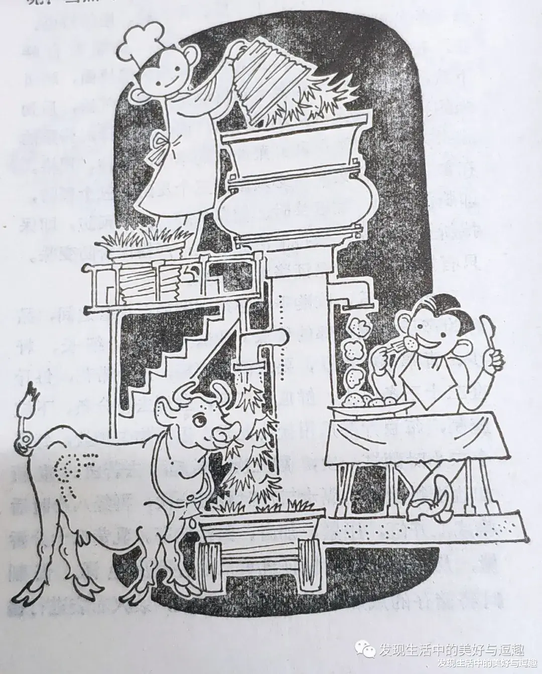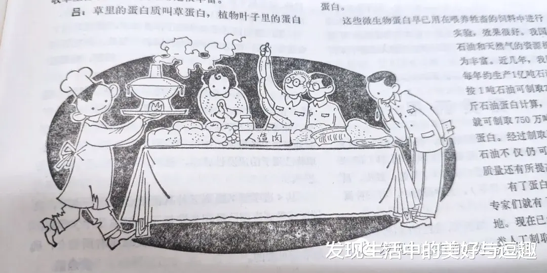 小时候喜欢这个插图,还照着这个插图画了很久,上面倒入稻草,从这边出来就是牛的饲料,从那边出来就是人们爱吃人造食品。