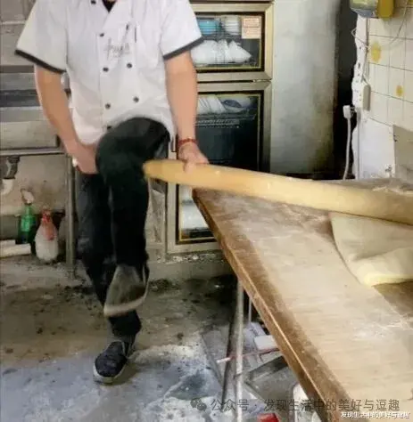 锅盖面用的是跳面,是面团放在案板上,由人坐在竹杠一端,另一端固定在案板上,上下跳跃,反复挤压成薄薄的面皮,用刀切成面条。