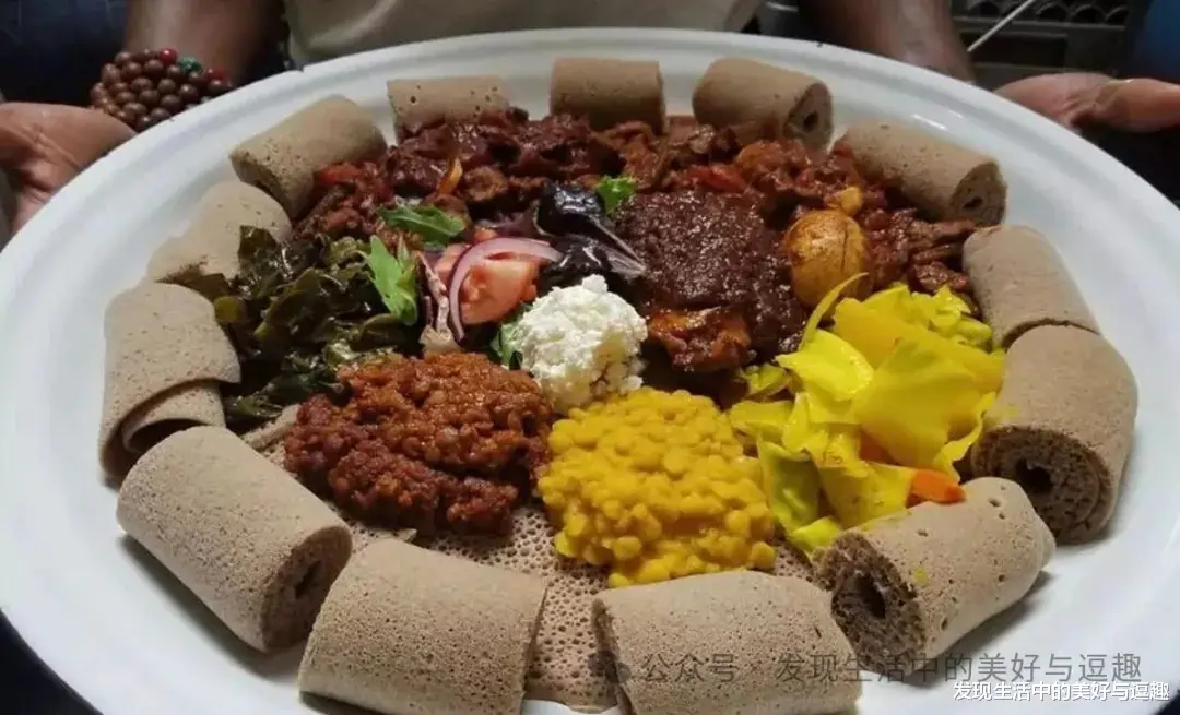 英吉拉是埃塞俄比亚的传统主食,由苔麸发酵制成,外观类似布满细洞的大摊饼,味道偏酸,触感绵软,通常配合酱料食用。
