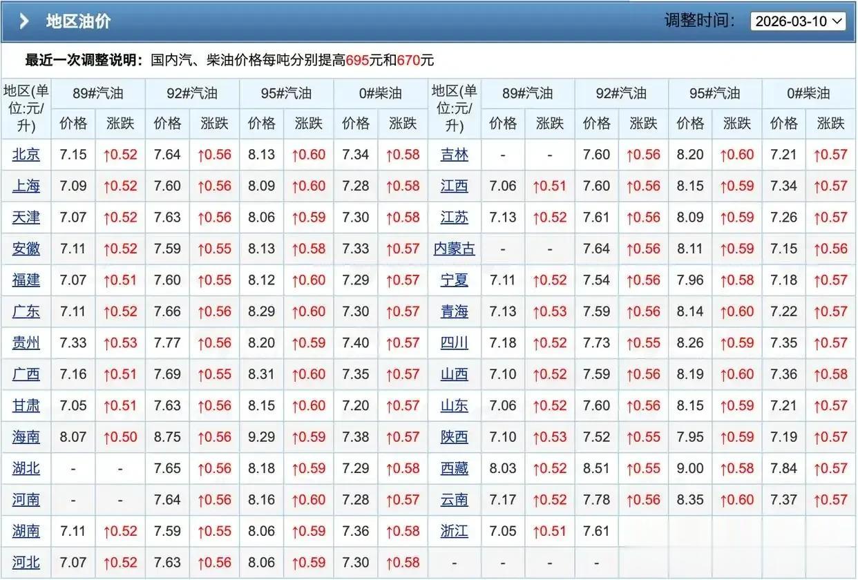 国内油价调价窗口一开,直接涨疯了。3月10日那波调整,汽柴油一吨涨了六七百,3月23日新一轮还在路上,照现在的国际油价算,起步就是一千五百块一吨的涨幅。92号、95号、0号柴油,价格表每天都得刷新一遍,尤其是沿海、华东、华南这些地方,油站老板比谁都紧张。