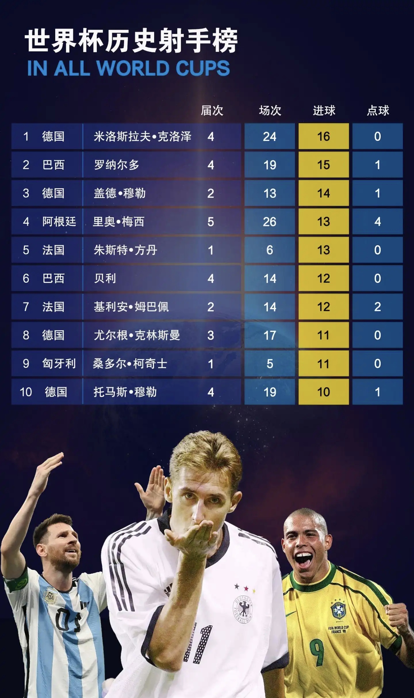 4、球王梅西13球排第四,世界杯历史最长的河,就不多说了。如果26世界杯能参赛且进3球以上则会超越克洛泽,毕竟下届48支球队参赛有很多菜鸡球队。