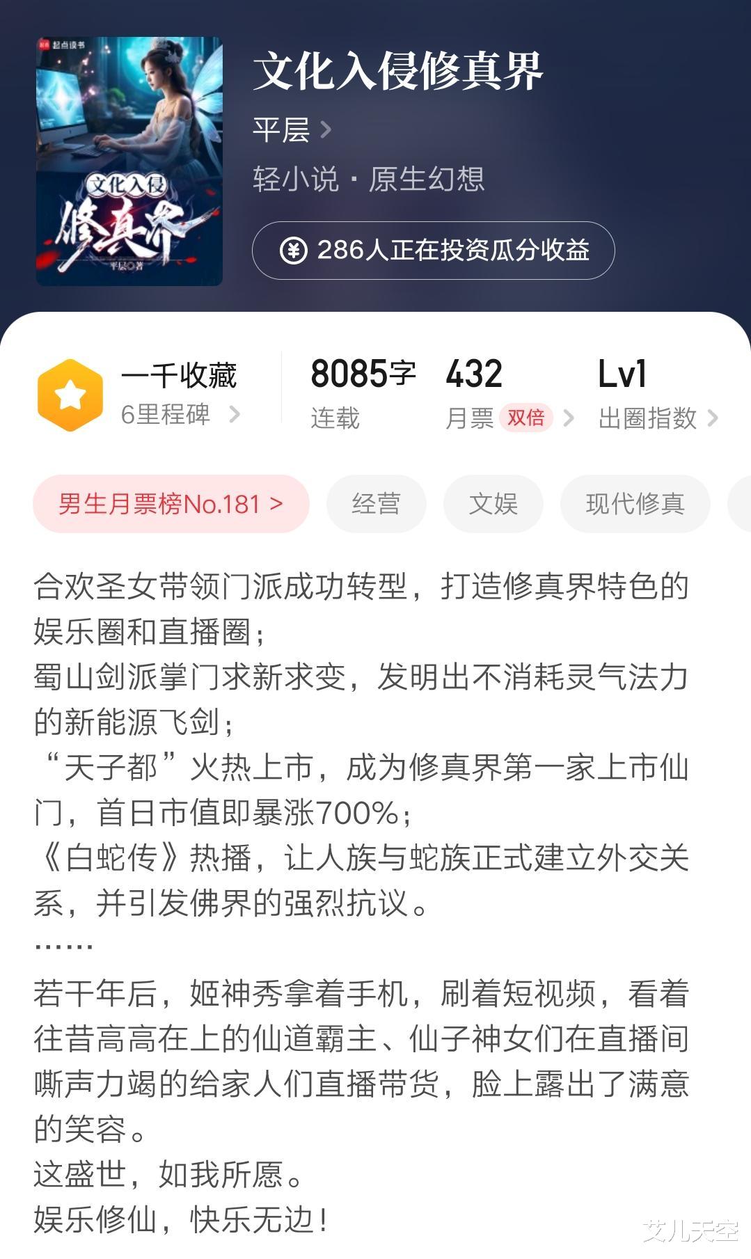 除了净无痕在国庆开了新书,另一位万订作者平层也上传了新书《文化入侵修真界》。