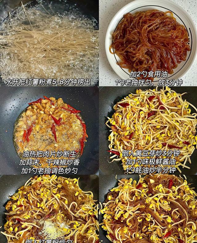 还有一道是豆芽粉条炒肉,这个真的超级简单,随便炒炒就能上桌。主要是把粉条提前泡软,豆芽洗干净。然后热锅下油,把肉丝炒熟,再加入豆芽和粉条一起翻炒。最后加点盐和酱油调味就行了。这道菜我特别喜欢,因为豆芽脆嫩,粉条滑溜,再配上肉的香味,简直是绝配。