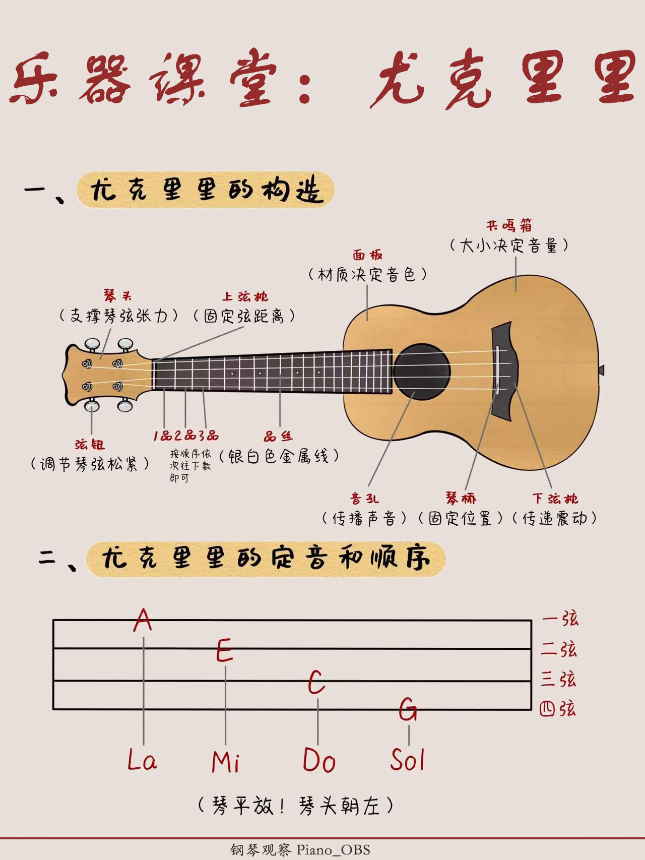 乐器课堂:尤克里里尤克里里Ukulele即夏威夷四弦琴,是一种夏威夷的传统弹拨乐器,发明于葡萄牙,盛行于夏威夷,乐器种类为弹拨类弦鸣乐器。1879年,葡萄牙的专业手工艺人和乐器制作家Manuel Nunes和Joao Fernandes还有Augustine Dias来到夏威夷群岛。他们发明和发展了来自他们家乡本土的琴。夏威夷人不仅惊讶于这种琴音色的优美,还惊讶于演奏者的手指在指板上的快速的移动。公认的最适合制作Ukulele的材料是产自夏威夷的稀有硬木树种。Ukulele常见的外形有两种,一种是吉他型,一种是菠萝型。Ukulele一般常见的四种尺寸:分成高音(soprano)、中音(concert)、次中音(tenor)与低音(baritone)四种尺寸,大小和构造都会影响Ukulele的音色与音量。