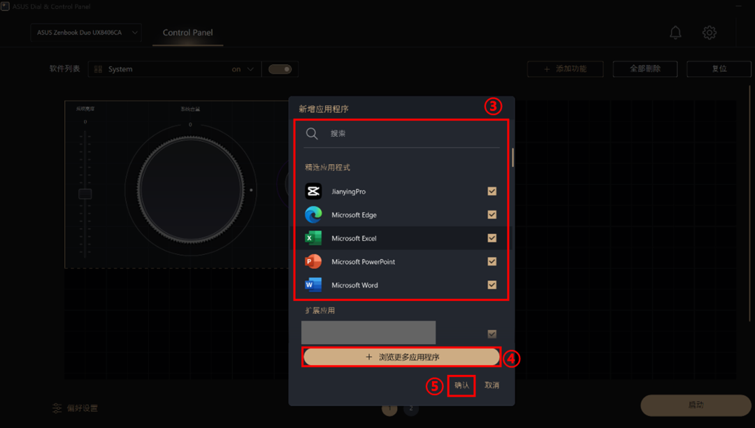 (2) 找到想要添加的应用程序,点击 ③[勾选],如果列表里面没有需要的应用,可以点击 ④[浏览更多应用程序] (仅限后缀为exe的程序),勾选完成之后,点击 ⑤[确认] 完成添加。