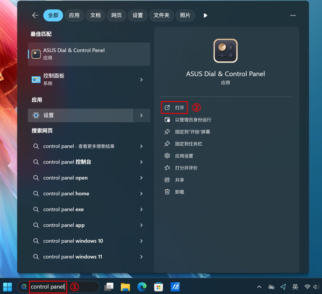 (1) 在Windows搜索框输入 ①[Control Panel],点击开启 ②[ASUS Dial & Control Panel] App。