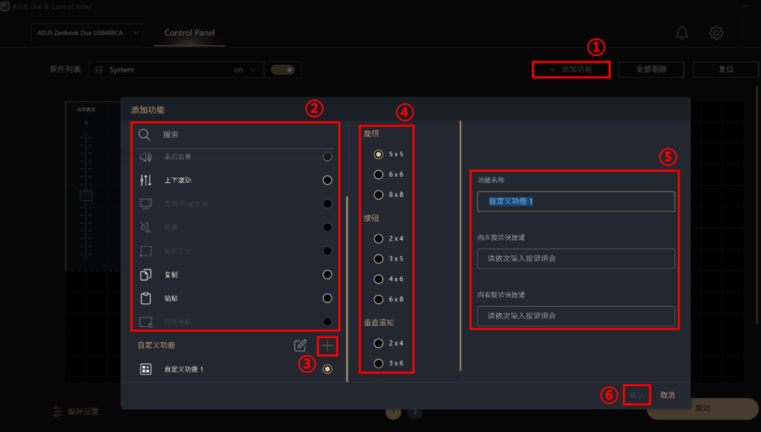 (1) 点击 ①[添加功能],在 ②[功能列表] 中添加默认功能,你可以手动添加想要的功能,点击 ③[添加]。[自定义功能] 已经添加,在 ④[模块] 区,为你新增的功能选择一个合适的模块,然后编辑新增模块要行使的 ⑤[功能](注意:添加“旋转快捷键”时,请“依次输入按键组合”,以 [Ctrl+C] 为例,请依次按下 [Ctrl] 键和 [C] 键),编辑完成之后,点击 ⑥[确认]。