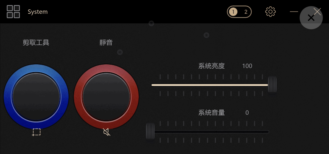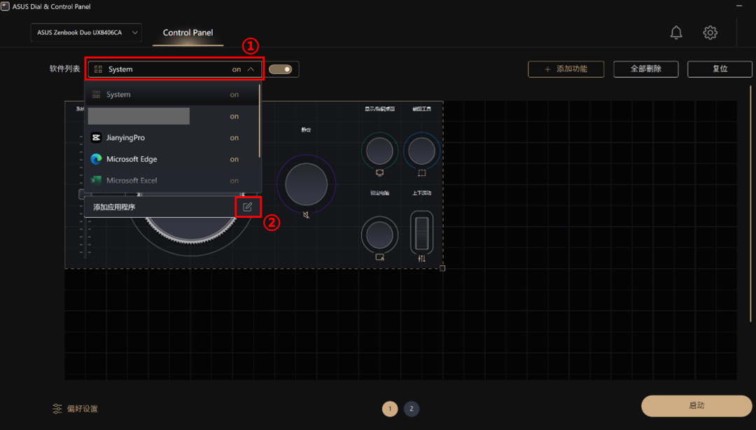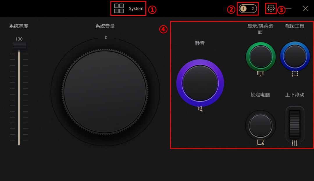 (3) 启动后,①[软件] 显示当前使用的软件名称,点击 ②[页面] 切换模块页,点击 ③[设置] 开启ASUS Dial & Control Panel软件,在 ④[功能区] 使用Control Panel功能。