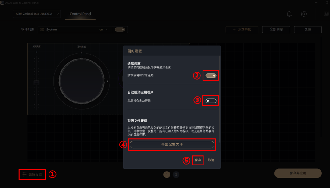 (1) 点击 ①[偏好设置], 开启或关闭 ②[通知设置] 功能,开启或关闭 ③[自动启动应用程序],点击 ④[导出配置文件] 将现存的设置保存,点击 ⑤[保存],完成本次编辑。
