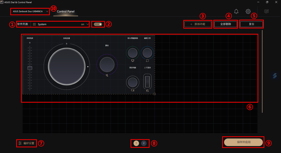 在Control Panel主界面中,有 ①[新增软件],②[软件开关],③[添加功能],④[全部删除],⑤[复位],⑥[模块区],⑦[偏好设置],⑧[页面],⑨[保存并应用],⑩[设备切换] 等功能。