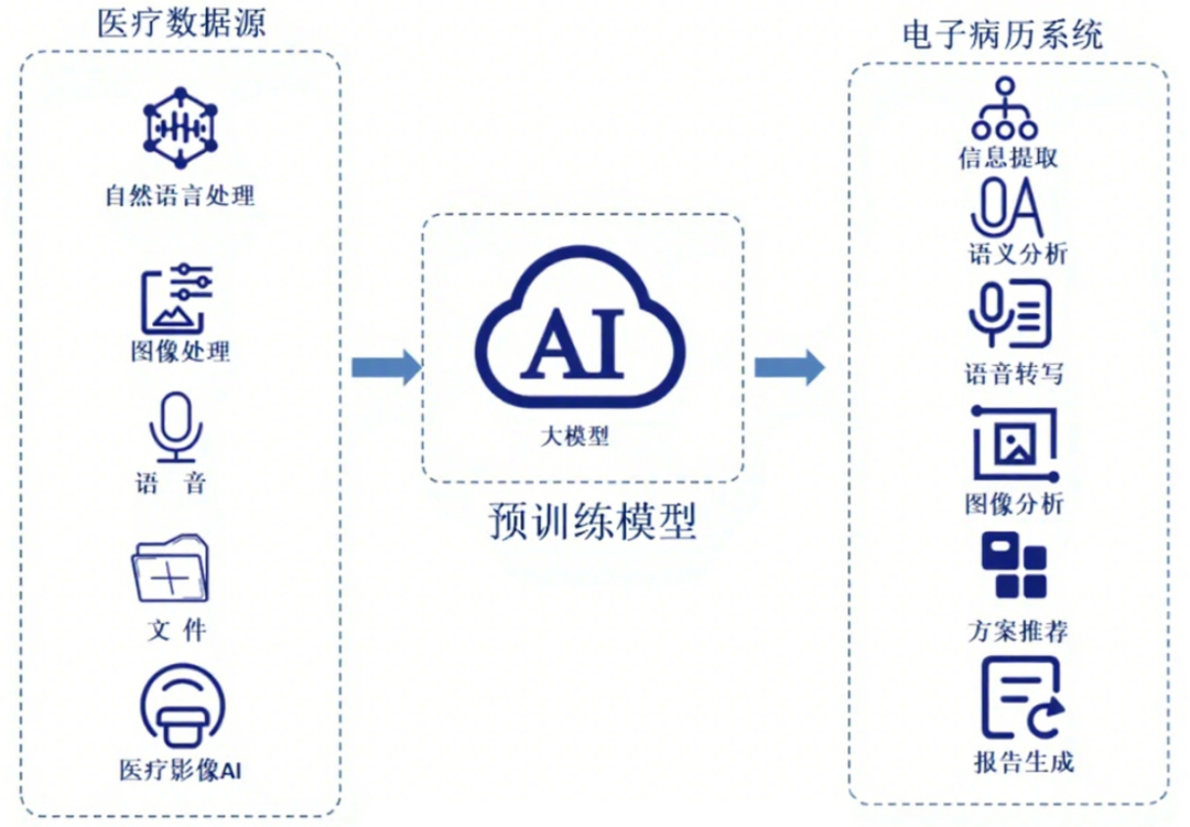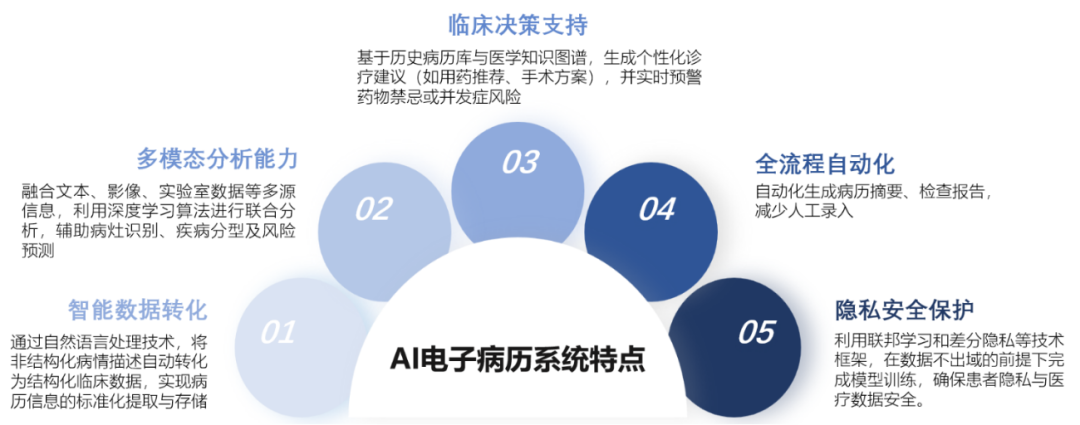 AI电子病历系统结合了各类人工智能技术学习框架,使其拥有了智能数据转化、多模态分析能力、临床决策支持、全流程自动化、隐私安全等特点。