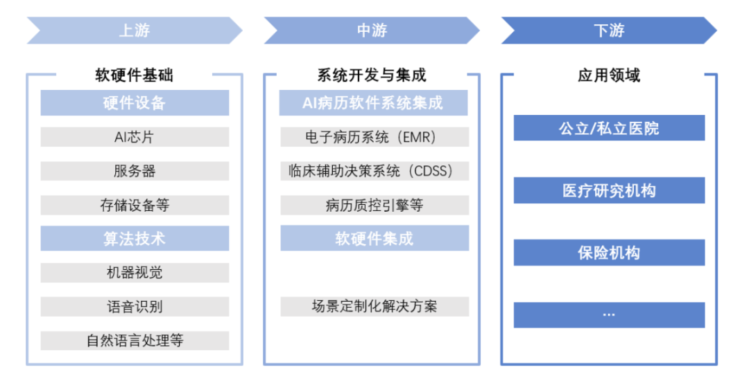 中游为软件系统集成商与软硬件定制化集成商。AI电子病历软件功能的实现需集成电子病历系统(EMR)、临床辅助决策系统(CDSS)和病历质控引擎等系统框架。而定制化方案提供商将集成各类软硬件系统,为不同类型的客户提供定制化系统方案。