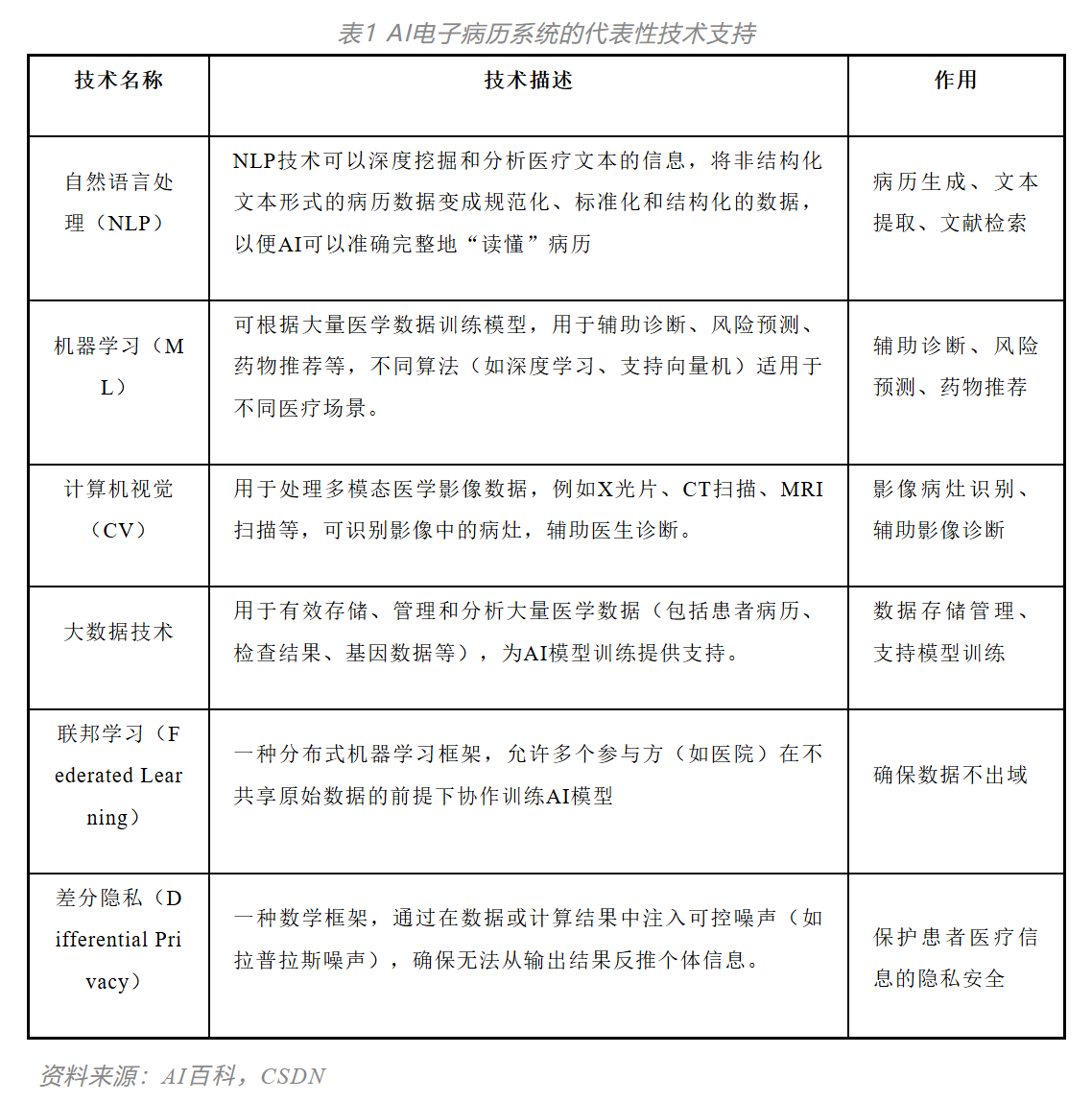 除此之外,机器学习(ML)、计算机视觉(CV)、大数据等几项核心技术也为AI电子病历系统提供了支持,而联邦学习与差分隐私等学习框架保障了患者医疗信息的隐私安全。