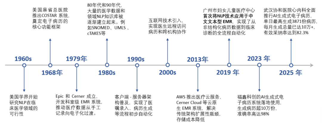 从60年代学界开始研究NLP技术在临床医学领域的可行性,到如今AI生成式电子病历系统在三级医院落地应用,EMR技术与医疗NLP技术经历半个世纪的发展,融合成为如今的智能AI电子病历系统。