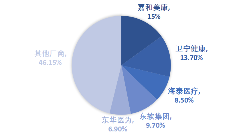 国内电子病历市场呈现半垄断格局,2024年CR5达53.9%,嘉和美康、卫宁健康、海泰医疗、东软集团、东华医为5家巨头占据半数以上市场份额。