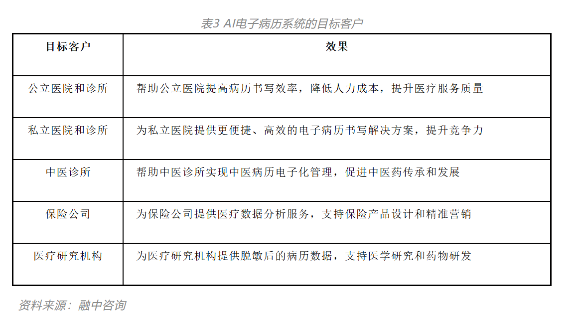 AI电子病历系统的目标客户主要有公立/私立医院和诊所、中医诊所、保险公司、医疗研究机构等。