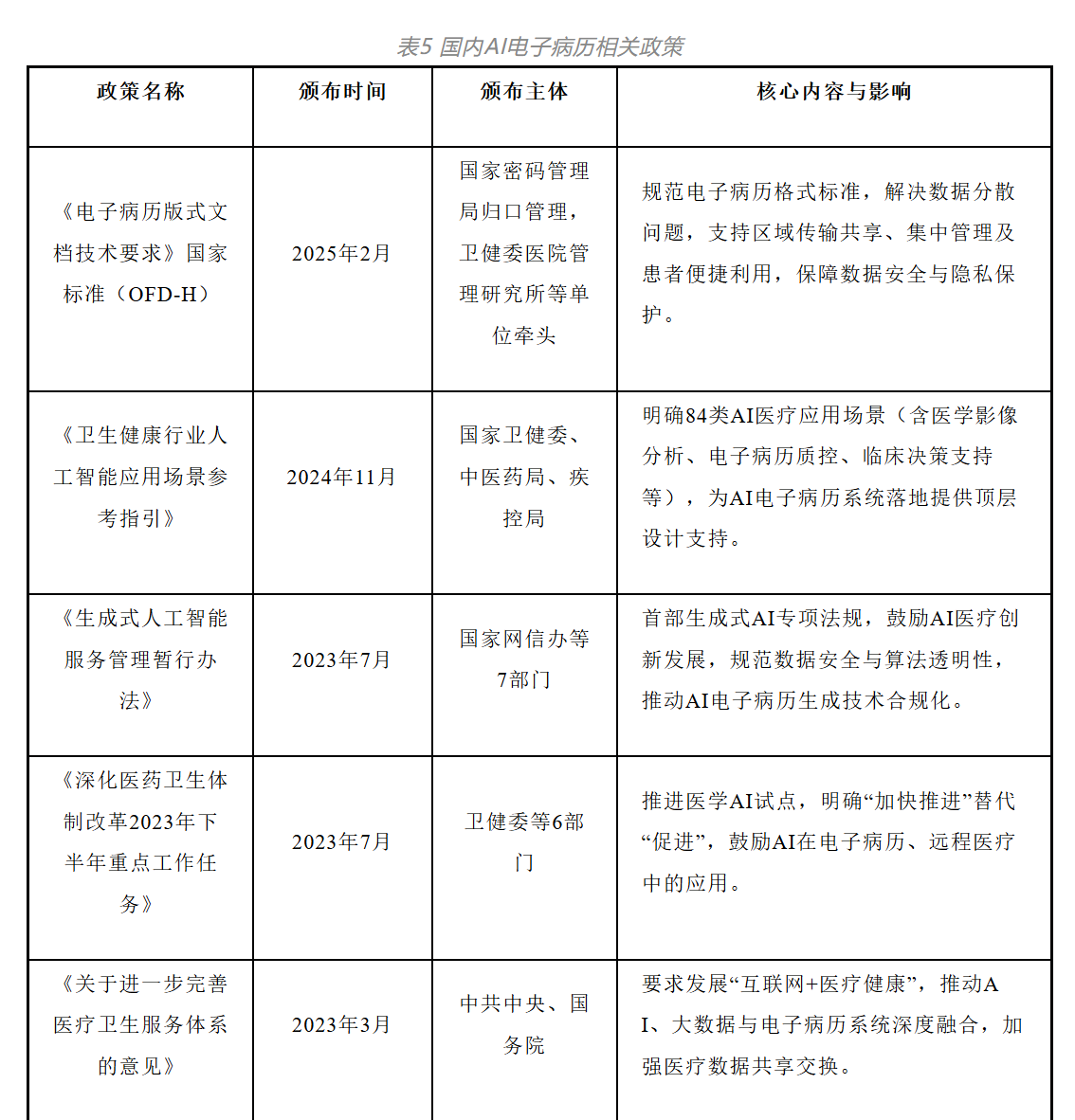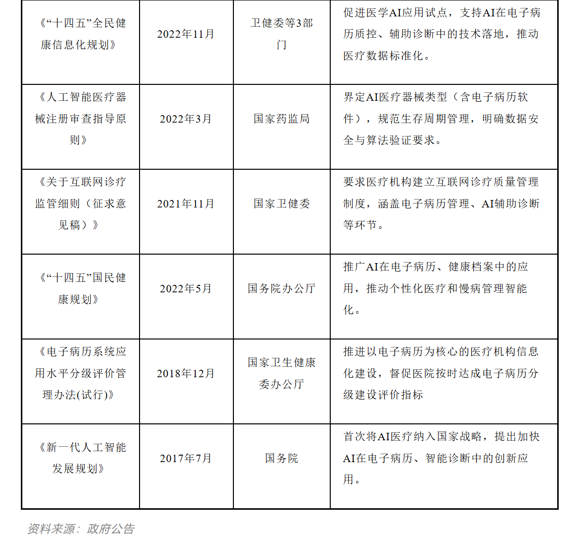 国内AI电子病历系统的政策风向整体呈现持续强化支持与规范化引导的态势,政府通过一系列指导原则、行业标准及发展规划,明确将AI医疗列为重点发展领域,强调合规性、数据安全要与技术创新并重,旨在推动电子病历系统向智能化、标准化升级,为AI在医疗场景的落地提供政策保障和方向性框架,助力行业高质量发展。