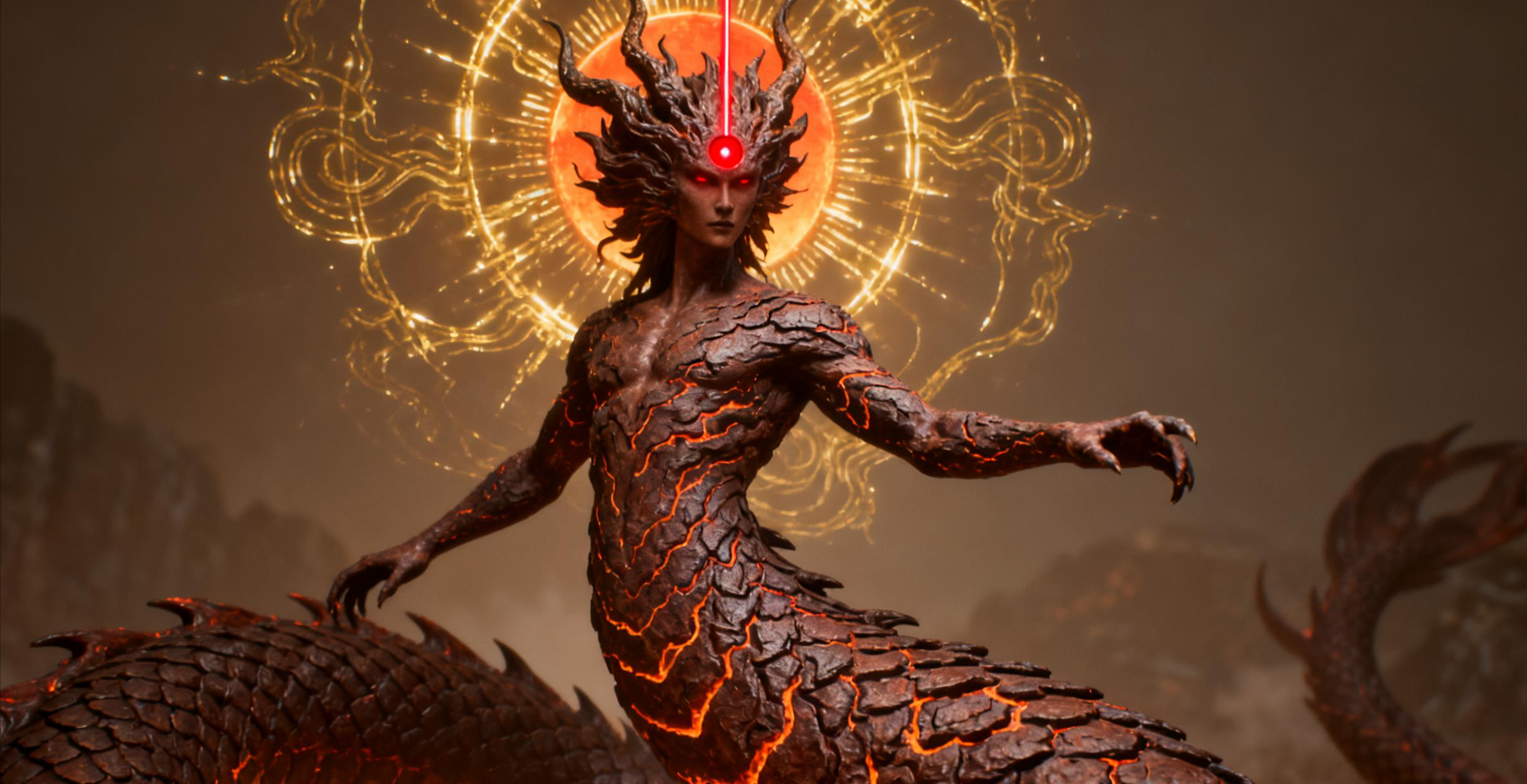 它是这五大凶兽里的 “天花板”,甚至比盘古还古老 —— 身躯是人身蛇尾,体长千里,皮肤是深褐色的,上面布满了像火山岩一样的纹路。最奇特的是它头顶的眼睛:那是一只红色的竖瞳,像缩小的太阳,周围环绕着金色的光纹。
