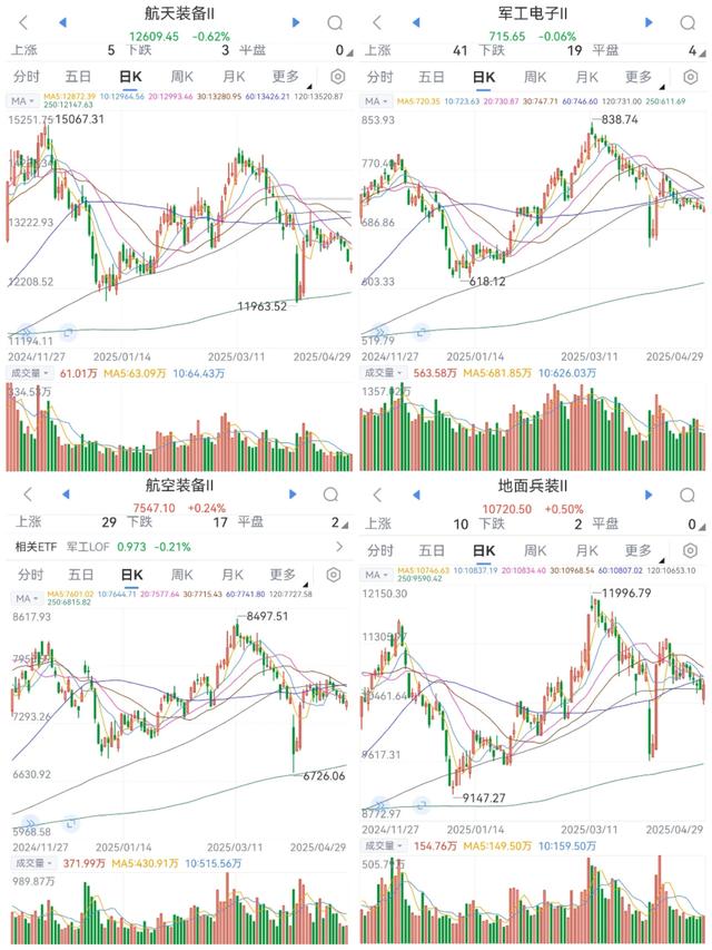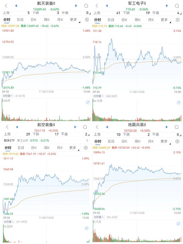 航天装备(10日1天净买入,五日-3.1亿,当日-0.3亿),早已突破10月8日高点,年后反弹宽幅震荡向上,大幅回调又探底,反弹强劲反包巨阴,站上250日均线,日内下跌态势未变;军工电子(10日1天净买入,五日-12.3亿,当日-3.8亿),早已突破10月8日高点,年后反弹宽幅震荡向上,连续回调探底又反弹,反包巨阴后回调,下方仅剩250日均线,日内微绿态势不变;航空装备(10日3天净买入,五日-20.7亿,当日-1.2亿),早已突破10月8日高点,年后震荡反弹力度一般,大幅回调又连续反弹,反包巨阴,收复250日均线,日内微红态势未变;地面兵装(10日2天净买入,五日-3.4亿,当日+0.1亿),早已突破10月8日高点,年后反弹又再创新高,大幅回调再度探底,长阳反包巨阴,探底基本结束,120、250日均线在下方,日内微涨120日均线失而复得。