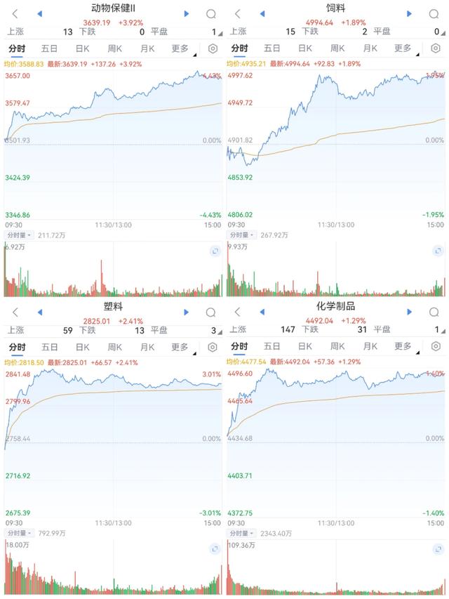 宠物经济(动物保健和饲料),开盘后一直斜线拉升,收盘大涨或上涨,远胜大盘。