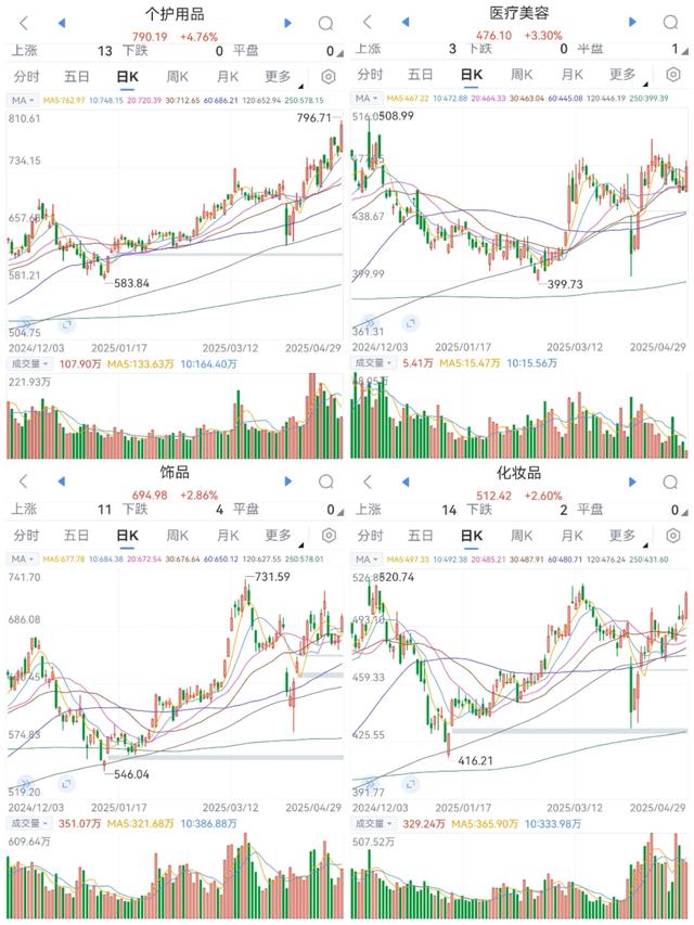泛消费。个护领涨,早盘至收盘,一直默默拉涨,斜线一条直线,收盘大涨。医美和化妆品,早盘高走后震荡,接近午盘,开始拉升和上涨,震荡上扬直至收盘,收盘也是大涨。黄金饰品调整后回归,开盘随即拉升,拉升后平走震荡,直至收盘。涨幅也可观。