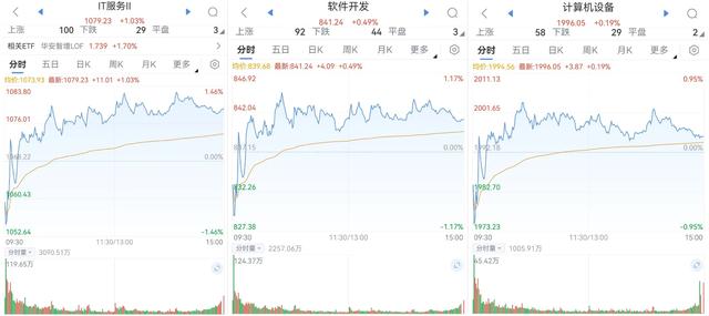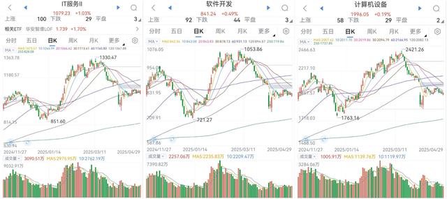 软件开发(10日4天净买入,五日-21.8亿,当日+0.0亿),早已突破10月8日高点,年后反弹又突破前高,震荡后又下跌,跌破120日均线连续探底,连续反弹,日内微红,与5、10、20日均线搅做一团;计算机(10日1天净买入,五日-24.0亿,当日-2.2亿),早已突破10月8日高点,年后反弹又突破年前高点,震荡后又下跌开始探底,连续反弹收复250日均线,日内微红态势不变;IT服务(10日5天净买入,五日-8.9亿,当日+7.9亿),早已突破10月8日高点,年后反弹又连创新高,震荡后又下跌,跌破120日均线连续探底,连续反弹,日内上涨,收复5、10、20日均线。