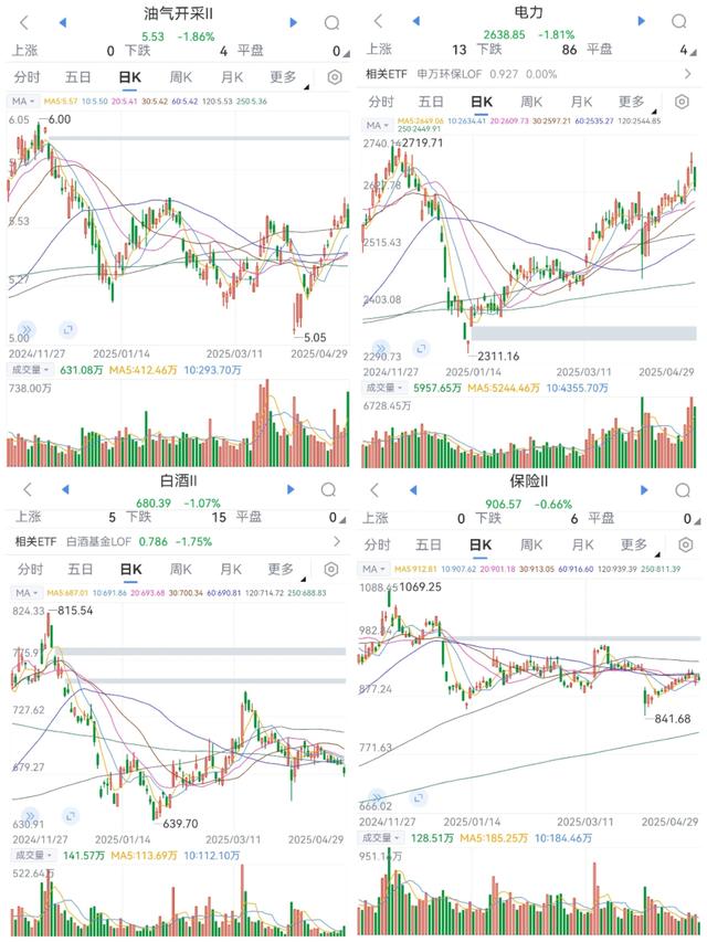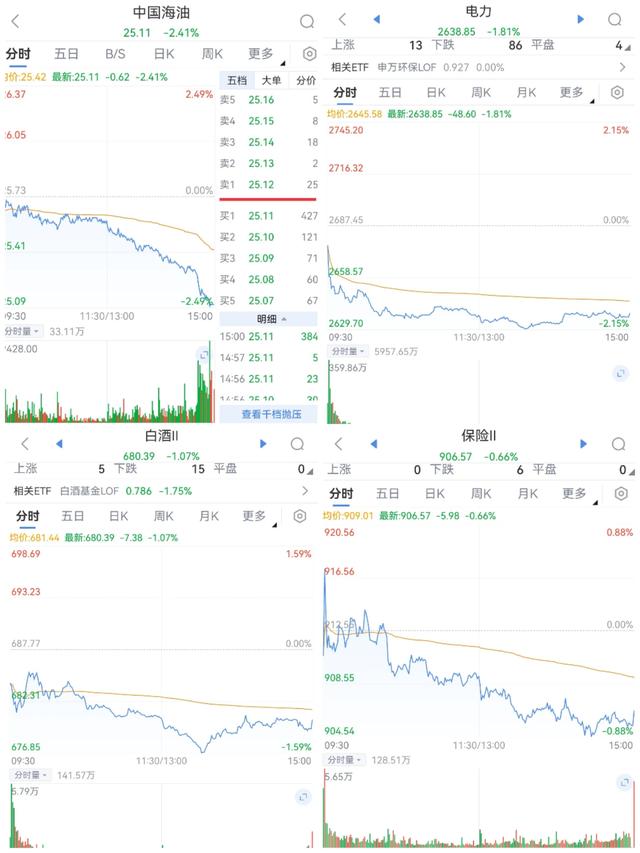 红利。油气和保险,早盘稍许震荡,随即斜线向下,跌幅逐渐扩大,抵抗不大,保险跌幅一般,油气午后还加速,收盘大跌;电力和白酒,低开低走震荡碎步向下,直至午后,午后略有上行,小圆弧走势,收盘下跌,跌幅较大。