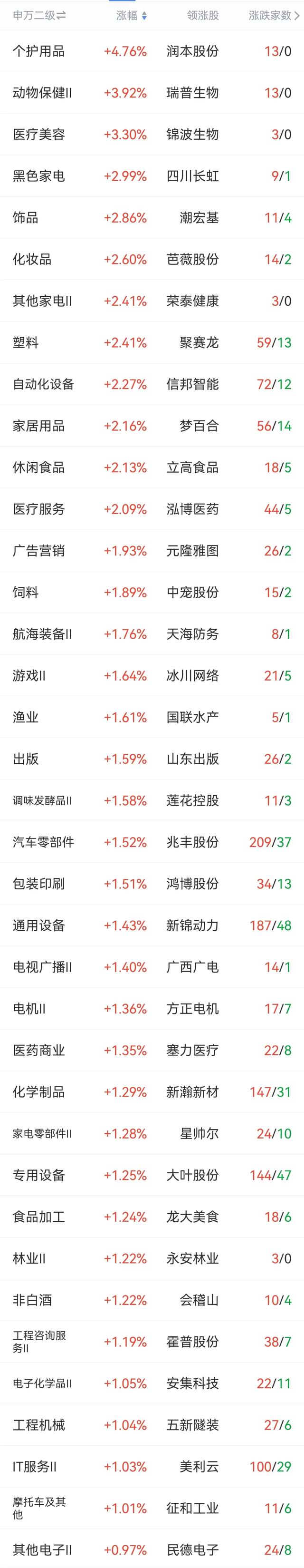 传统产业中的个护化妆品、医美饰品、饲料和动物保健、家居休闲食品饮料、家电、新材料、海洋经济(航海装备、渔业、林业)、传媒、调味品、汽车零部件和家电零部件、医药商业、化工、工程机械和工程咨询、摩托车等,热点中的智能制造(自动化、通用和专用设备,电机)、AI应用(医疗服务、广告营销)、IP(游戏)、芯片和其它电子、信安(IT服务)等涨幅居前。