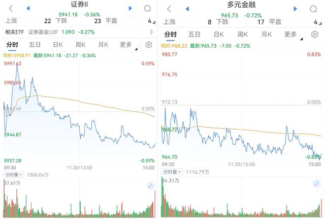 证券、多元。证券仍然无力,早盘拉升,跟随银行大幅下砸,震荡之中,跌幅继续扩大,收盘微绿,略输大盘。多元金融低开低走震荡,收盘微跌。