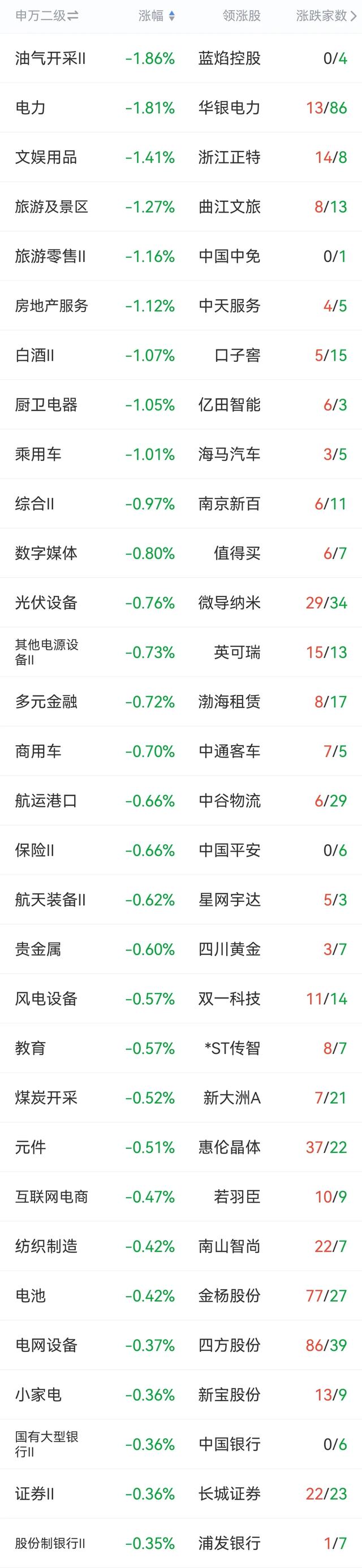 传统产业的油气开采、电力和电源电网设备、旅游、房地产服务、白酒、厨卫和小家电、数字媒体、商用车、航运港口、保险、贵金属、煤炭、纺织、国有大行和股份制银行等,热点中的IP(文娱)、汽车、新能源(风电、光伏和电池)、多元金融、国防军工(航天装备)、AI应用(教育)、互联网+、证券等跌幅居前