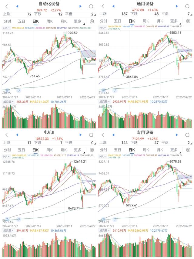 自动化设备(10日3天净买入,五日-5.7亿,当日+3.3亿),早已突破10月8日高点并连创新高,年后反弹又迭创新高,近期连续回调,跌破120日均线开始探底,有所反弹,日内上涨又收复5、10、20日均线;电机(10日3天净买入,五日+9.2亿,当日+4.5亿),早已远超10月8日高点,年后反弹又迭创新高,震荡后连续回调,跌破120日均线开始探底,连续反弹站上10、20、120日均线,日内上涨又收复刚跌破的5日均线;专用设备(10日3天净买入,五日-13.1亿,当日+4.9亿),早已突破10月8日高点,年后反弹又迭创新高,近日连续回调,跌破120日均线开始探底,连续反弹,收复120日均线,日内上涨又收复刚跌破的5、10、20日均线;通用设备(10日3天净买入,五日-0.6亿,当日+14.3亿),早已突破10月8日高点,年后反弹迭创新高,近日连续回调,跌破120日均线开始探底,连续反弹,站上10、120日均线,日内上涨又收复刚跌破的5、20日均线。