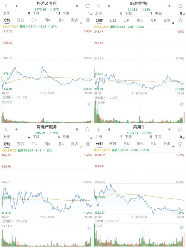 旅游、房地产、汽车。低开震荡或低开下砸后震荡,震荡中跌幅略有扩大,盘中抵抗也明显。收盘下跌,跌幅也一般。