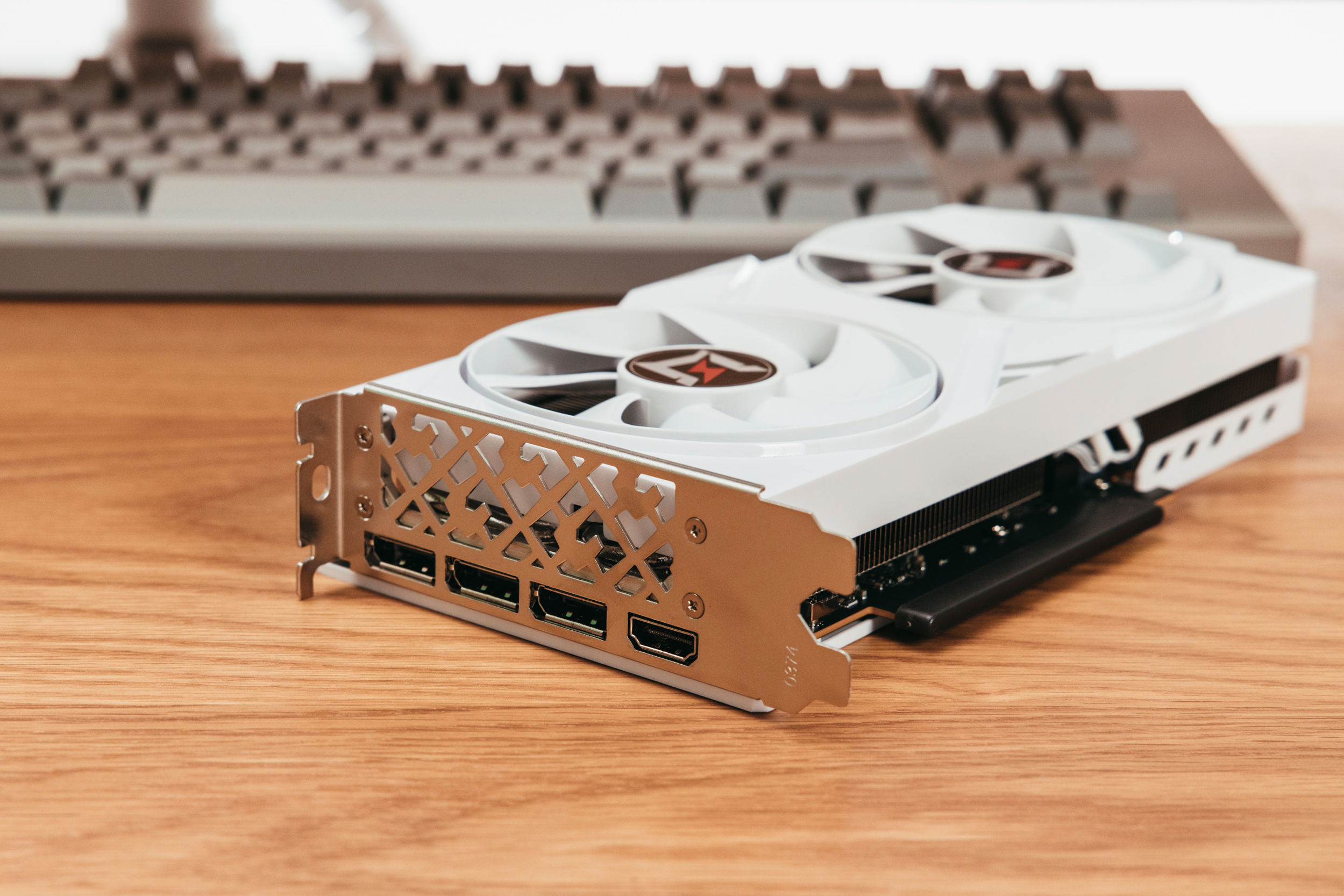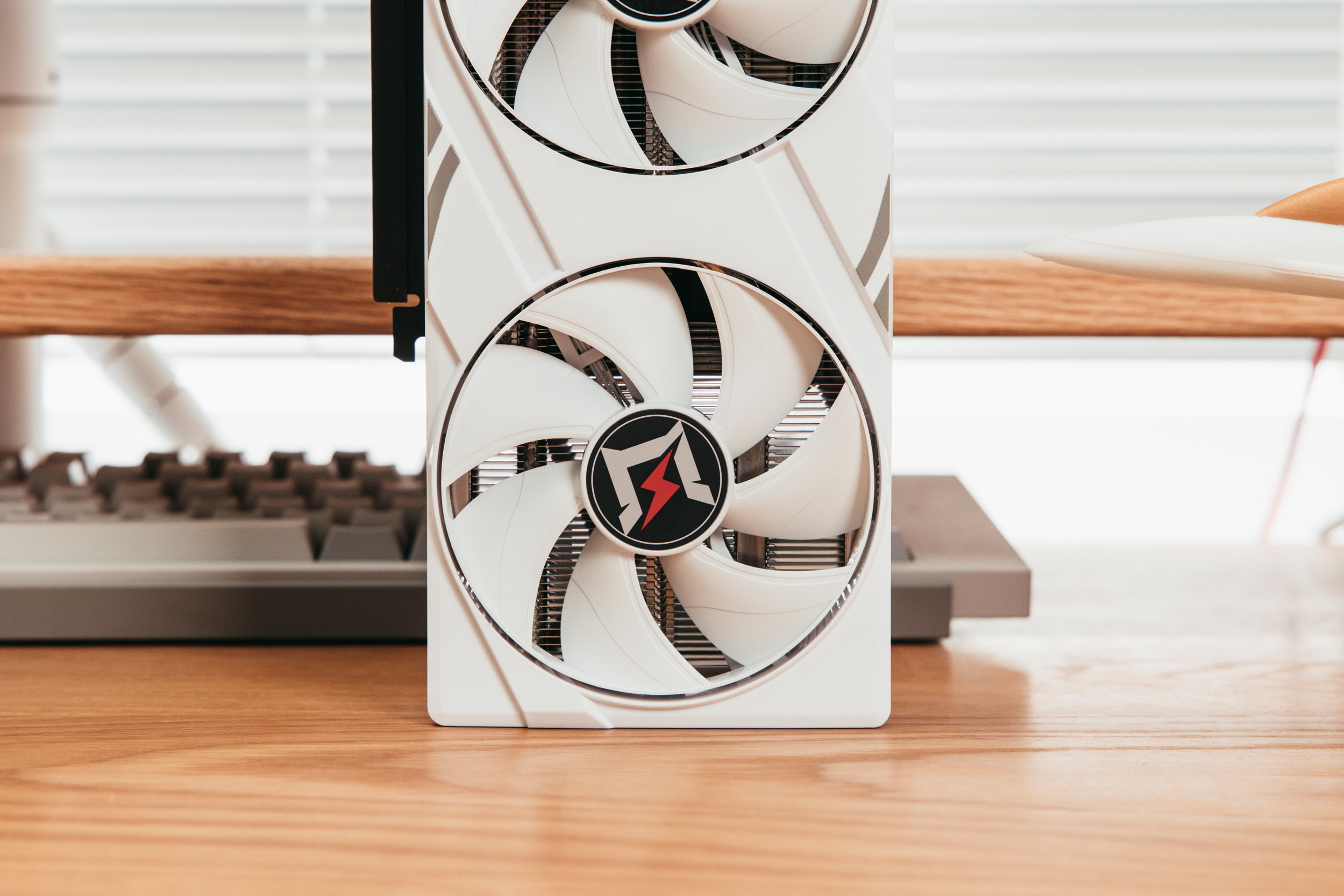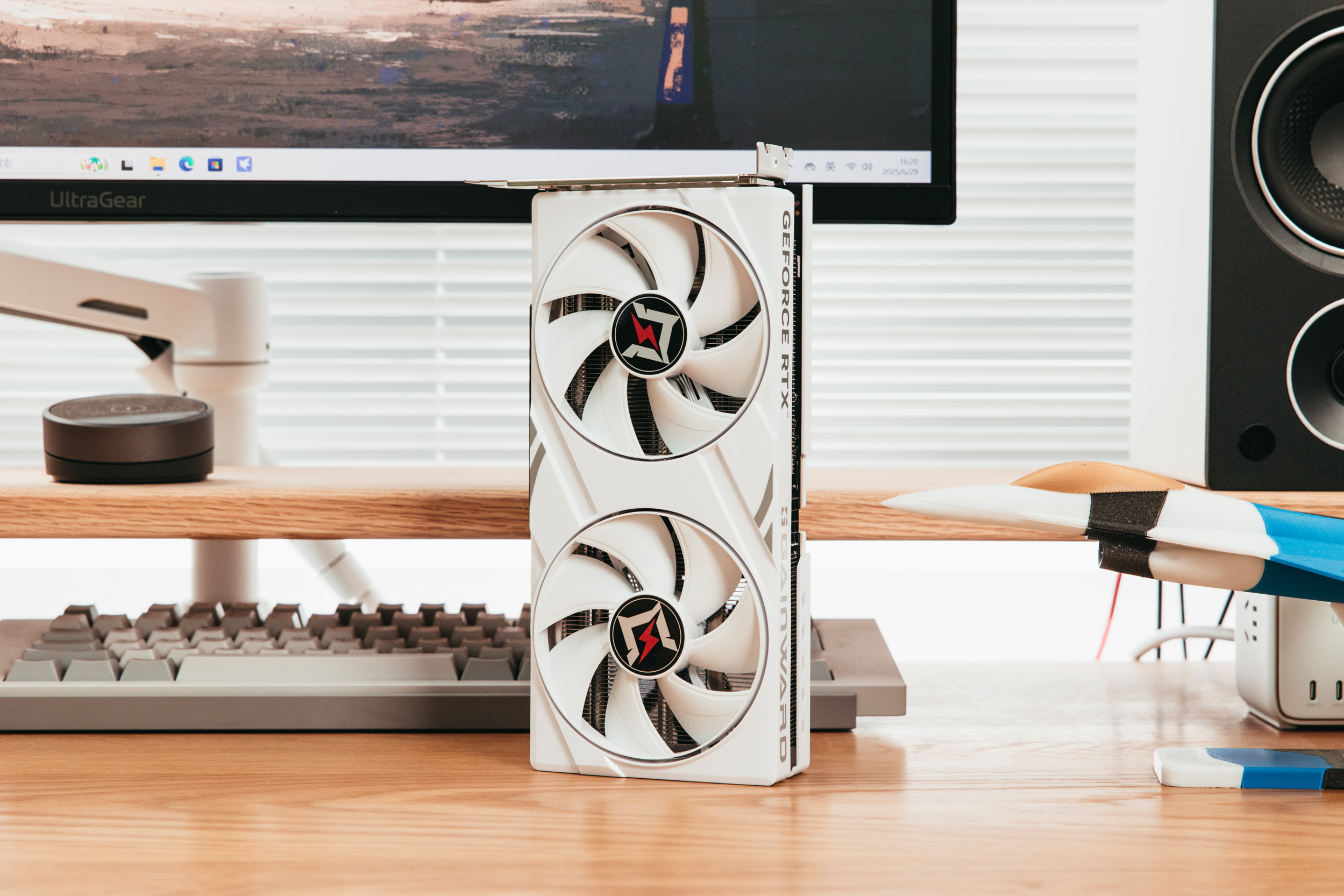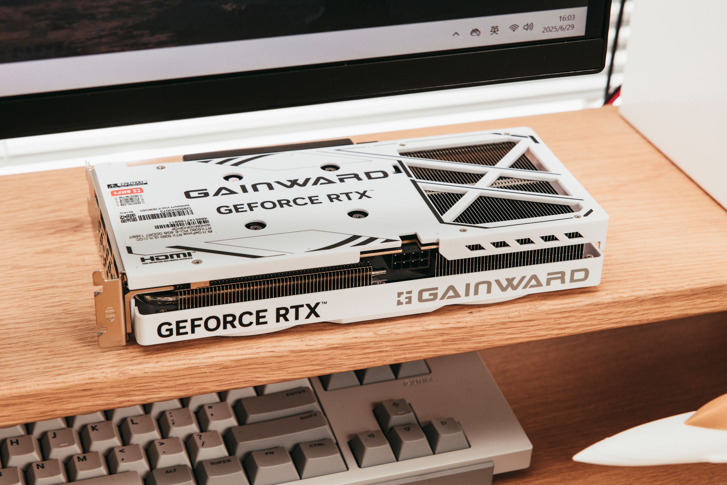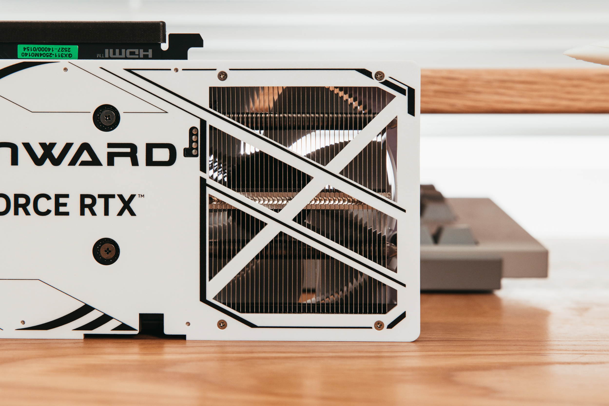 倒置的耕升5060追风OC 8G白色特写,完全的纯白无光显卡,很纯粹。