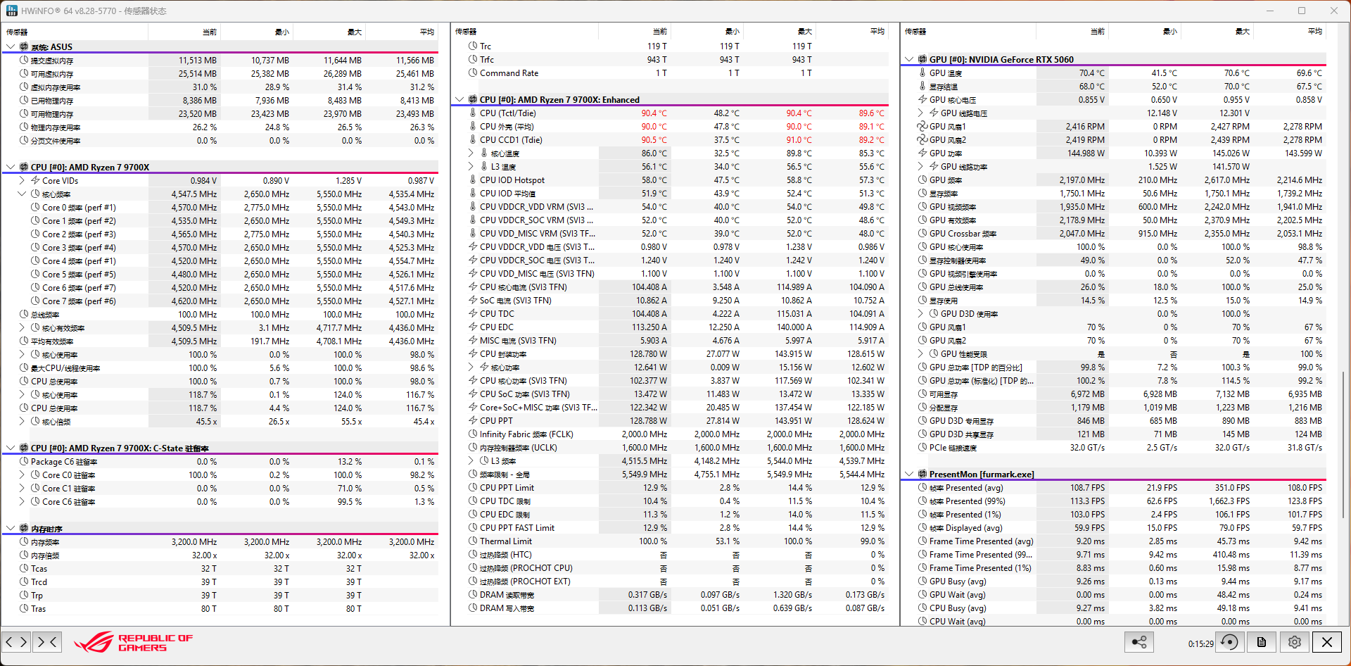 最近温度很高,室内开空调维持27度,在 AIDA 64 FPU+显卡甜甜圈双拷极限测试中,处理器核心平均温度85度,封装温度89度,最高90度,封装功耗平均128W;显卡温度表现正常,69度,功耗仅143W。