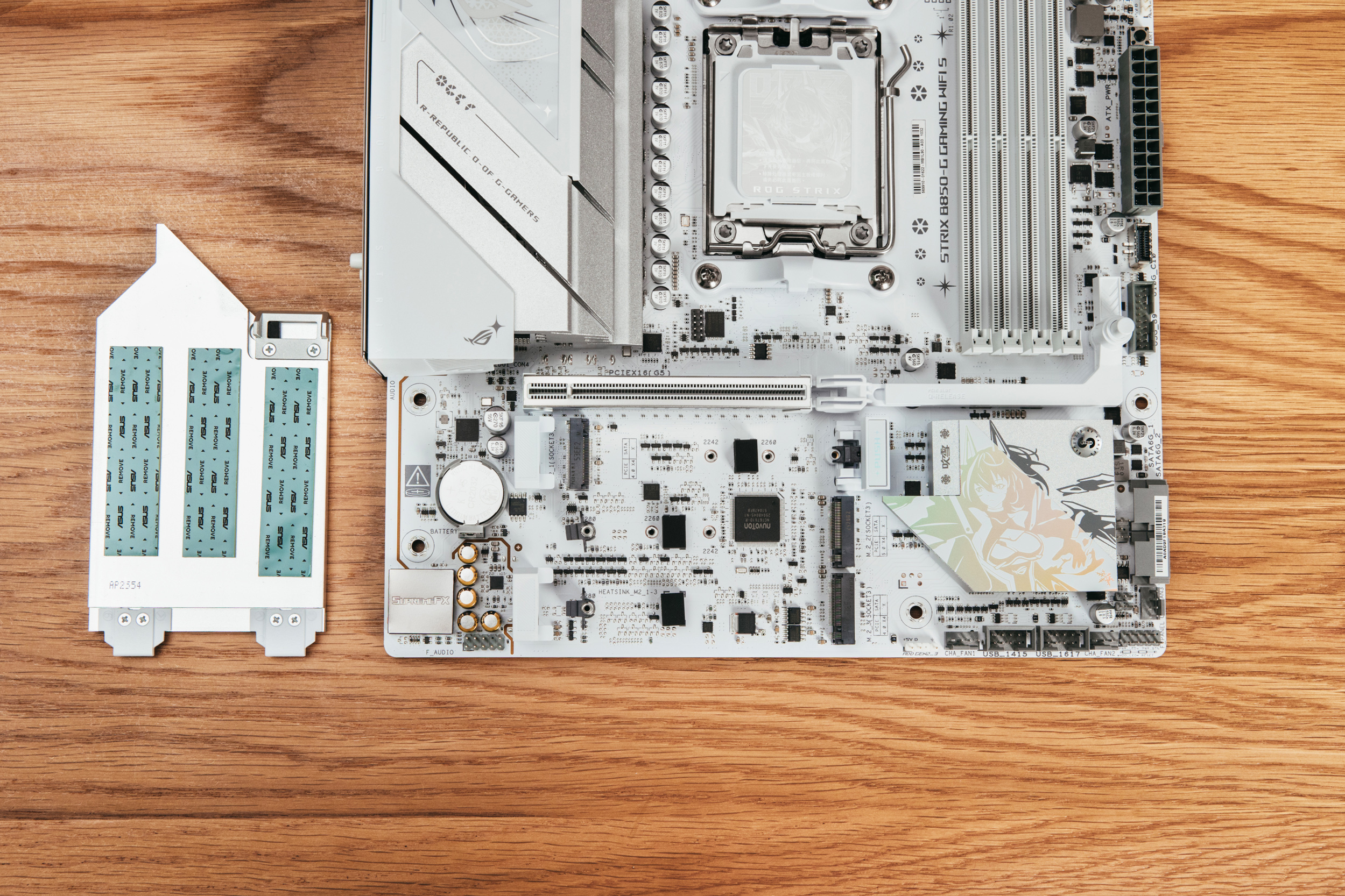 下半部分则被一张硕大的散装装甲覆盖,和X870吹雪一样,边缘做了圆润处理,值得一提的是这次散热装甲抛弃了螺丝固定的方式,而是和显卡、M.2插槽一样采用了快拆设计。