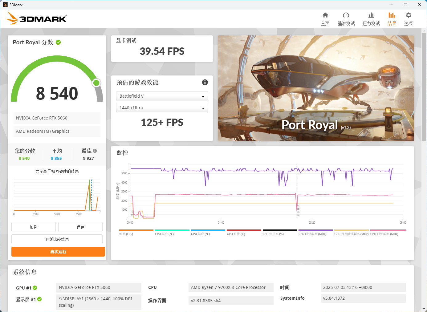 Port Royal成绩为8540,对比4060显卡6000左右的成绩提升明显。