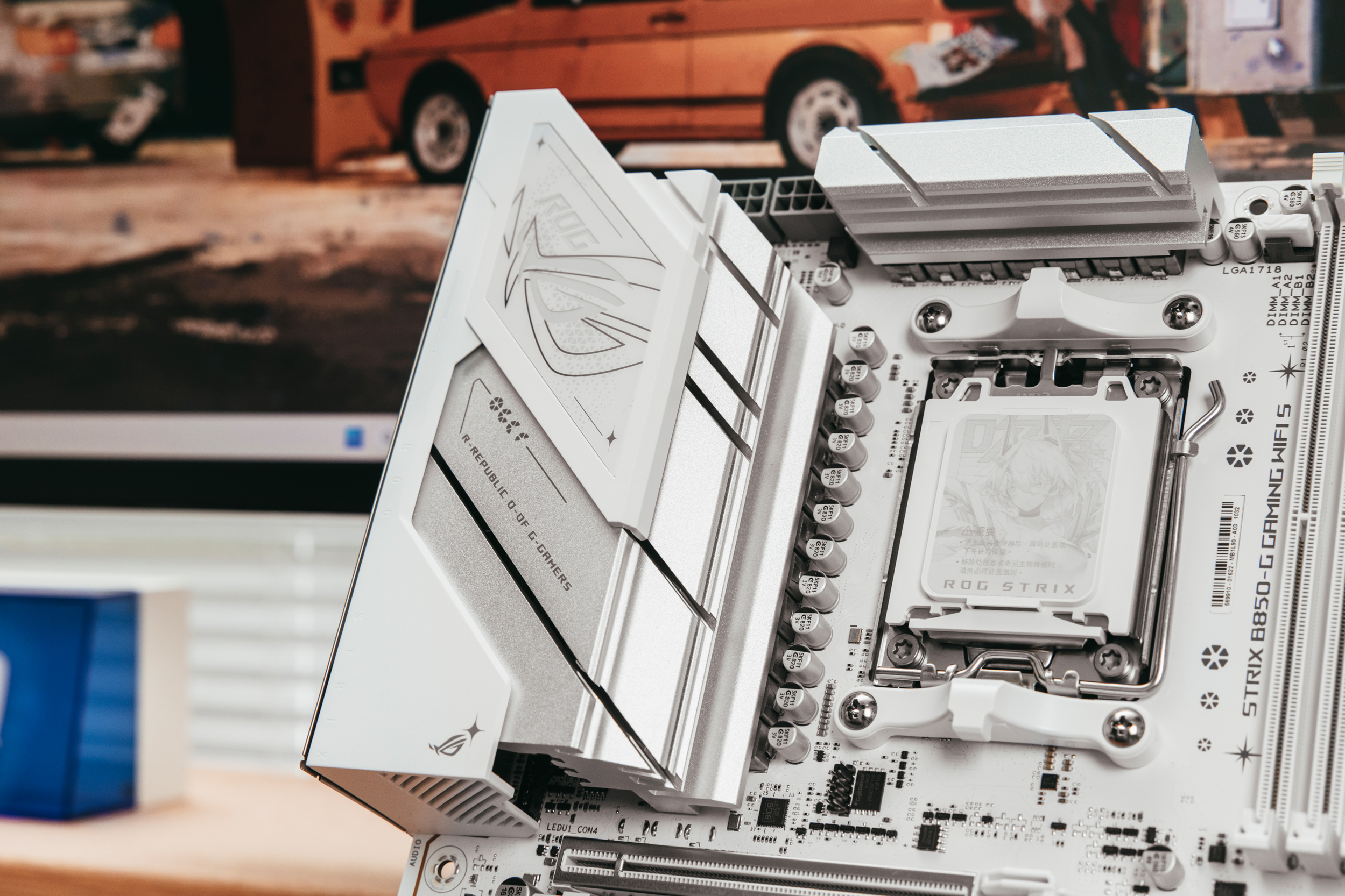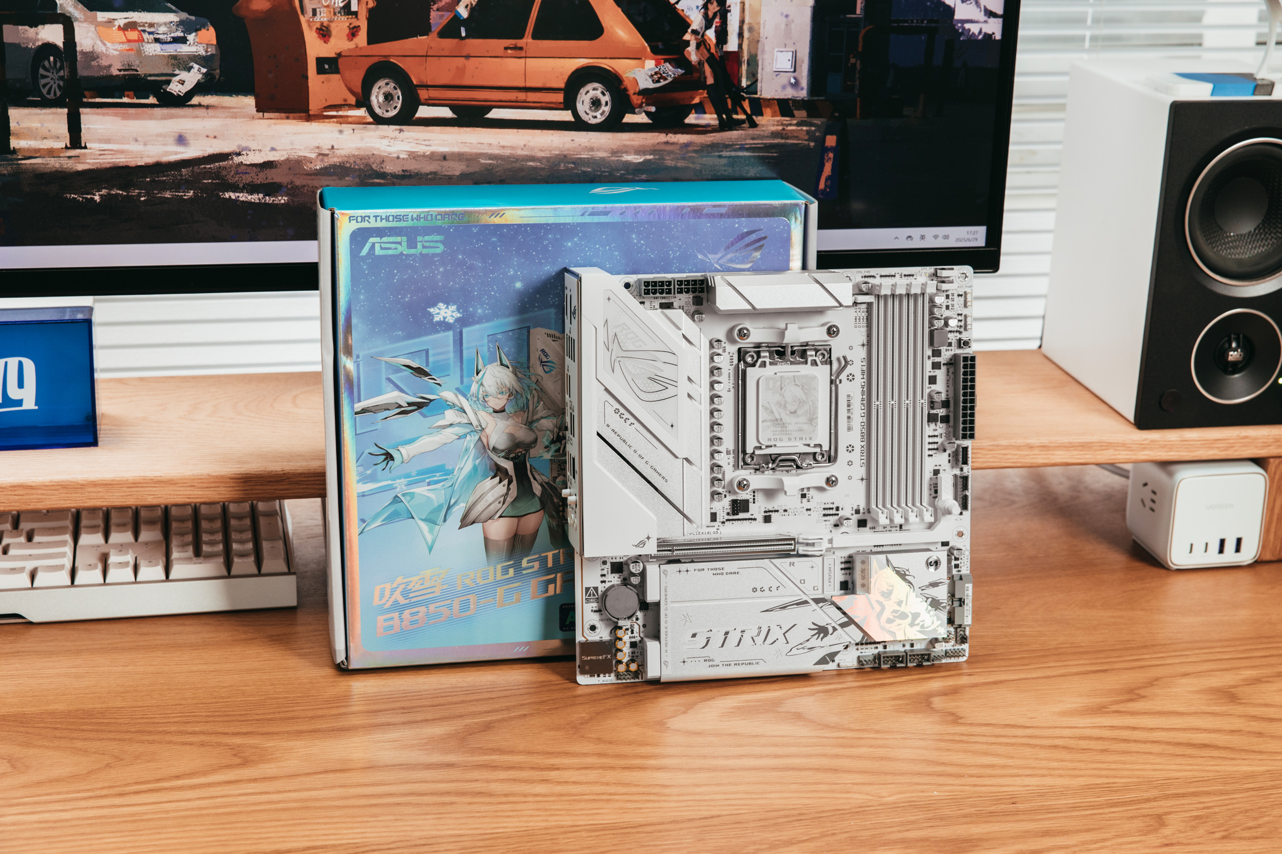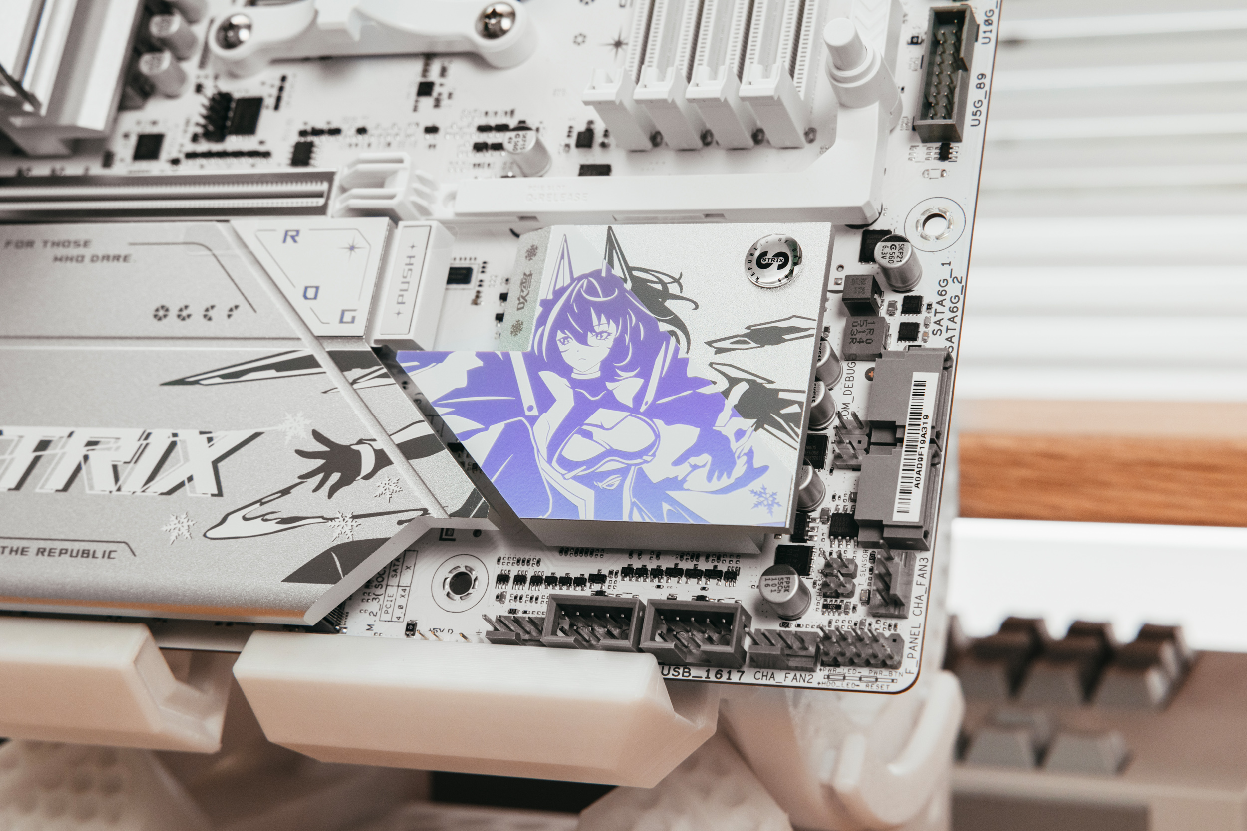 整张主板最显眼的地方为右下角的雪武战姬立绘,在不同角度和光线照射下会呈现不同的颜色。