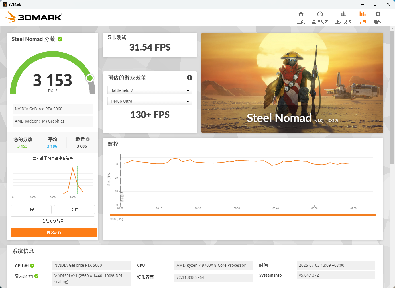 Steel Nomad跑分3153,显卡测试成绩31.54FPS,对比上一代4060成绩2200左右也有着不错的提升。