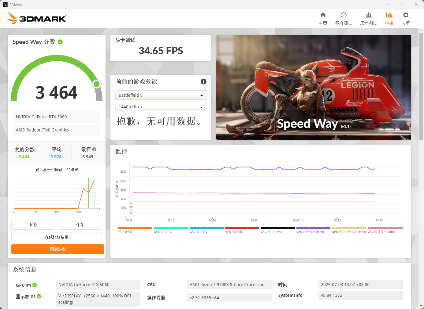 这张耕升5060追风OC在Speed Way中跑分3464,其中显卡成绩为34.65FPS,这个成绩对比4060显卡2500左右的成绩提升还是可以的。