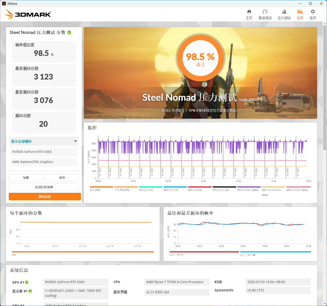 Steel Nomad压力测试,98.5%成绩通过。