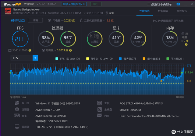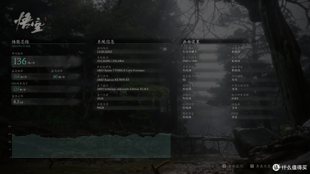 而3A游戏则统一2K分辨率。黑神话:悟空开启影视级画质、50%超采、帧生成自动挡下,平均帧率136fps,最低帧率60fps,95%帧率高于121fps。