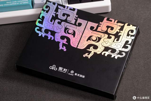 云彣(UniWhen®)在视觉统一性方面一直做得很出色,这次也不例外,外包装还是熟悉的墨黑主色搭配国韵元素。正面烫金印制的饕餮图腾在光线下能产生渐变光影,颜色还会随视角变化,仿佛自带RGB灯效。有收藏包装习惯的话,留着当个摆件也不错。