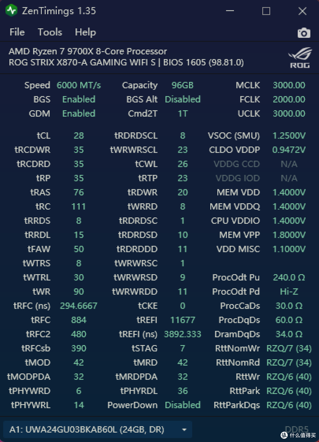 在开启EXPO一键超频后,由于插满了4根内存,所以硬件自检时间会更长一些。等待进入系统后用ZenTimings查看内存信息,绫龙DDR5确实跑到了官方标称的频率和时序。