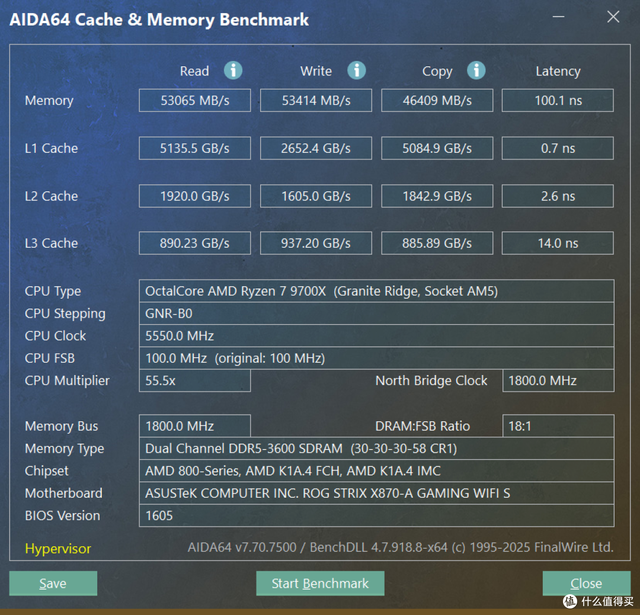 将4条24GB绫龙DDR5插满后,电脑依旧可以轻松点亮,不过频率并不是默认的5600MT/s,而是为了让电脑能够顺利点亮自动调整为更保守的3600MT/s。AIDA64内存基准跑分成绩也一般,读取53GB/s、写入53GB/s、拷贝46GB/s、延迟100ns。