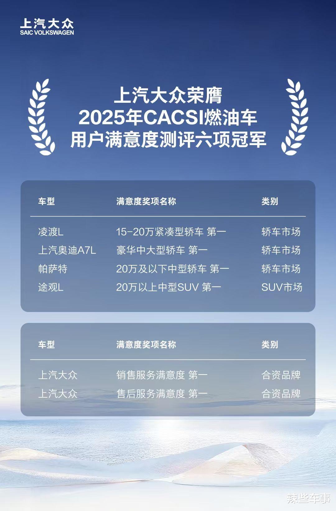 10月17日,第八届汽车质量论坛暨2025年中国燃油汽车行业用户满意度指数(CACSI)测评结果新闻发布会在北京召开,上汽大众摘得产品与服务两大板块共六项桂冠。产品方面,大众品牌三款车型凌渡L、帕萨特、途观L以及上汽奥迪A7L分别获得各细分市场用户满意度第一。服务方面,大众品牌同时摘得合资品牌销售服务和售后服务满意度两项冠军。这既源于上汽大众多年来对燃油车技术、品质、服务等全方位的持续投入,也是其在合资新时代坚持“油电同进”战略的成果显现。